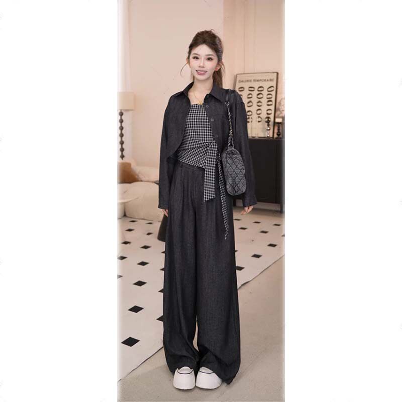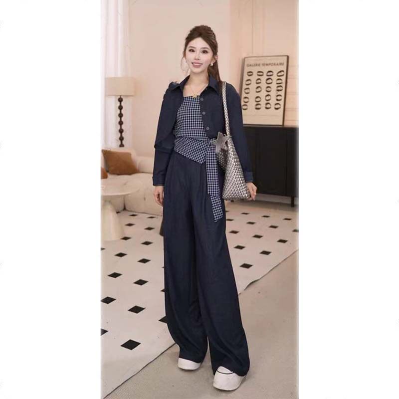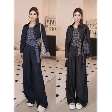 2026年早秋季气质时尚外套系带格子上衣阔腿裤三件套套装DM0001