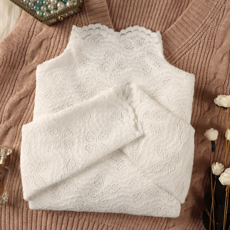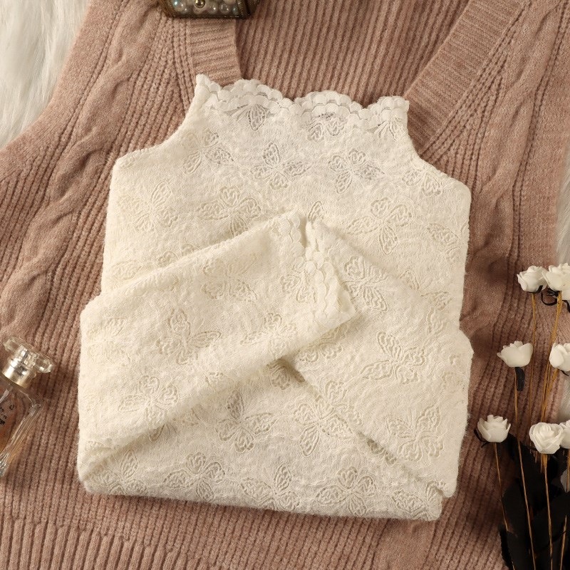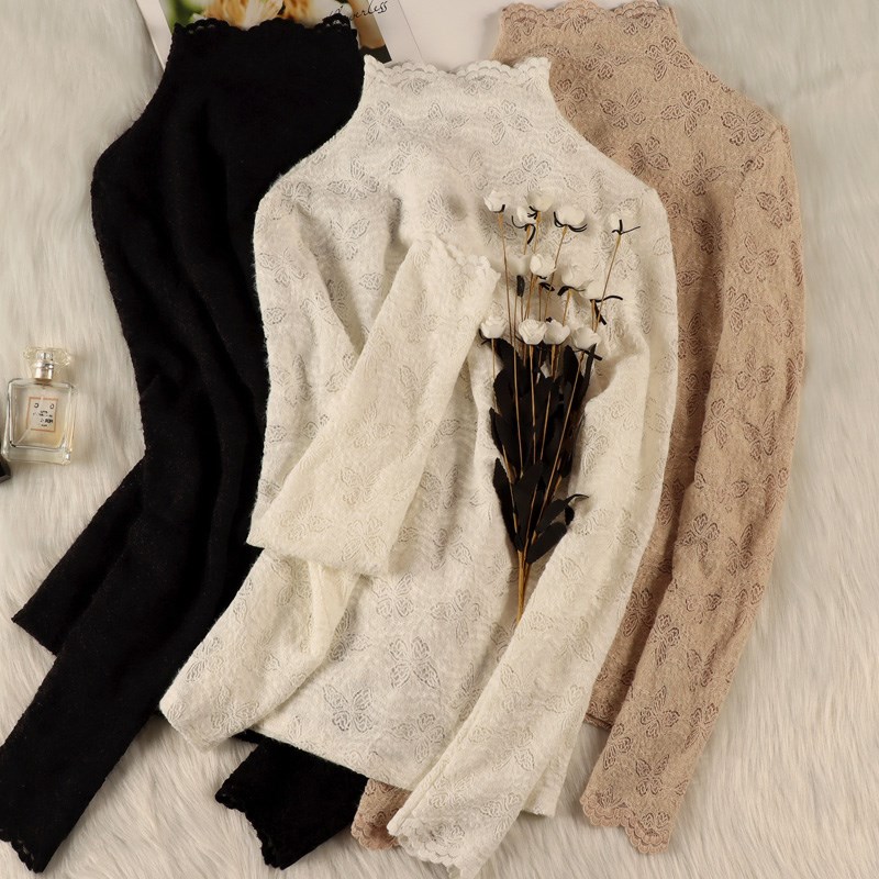 秋冬半高领磨毛蕾丝打底衫女内搭长袖2024新款保暖洋气小衫上衣