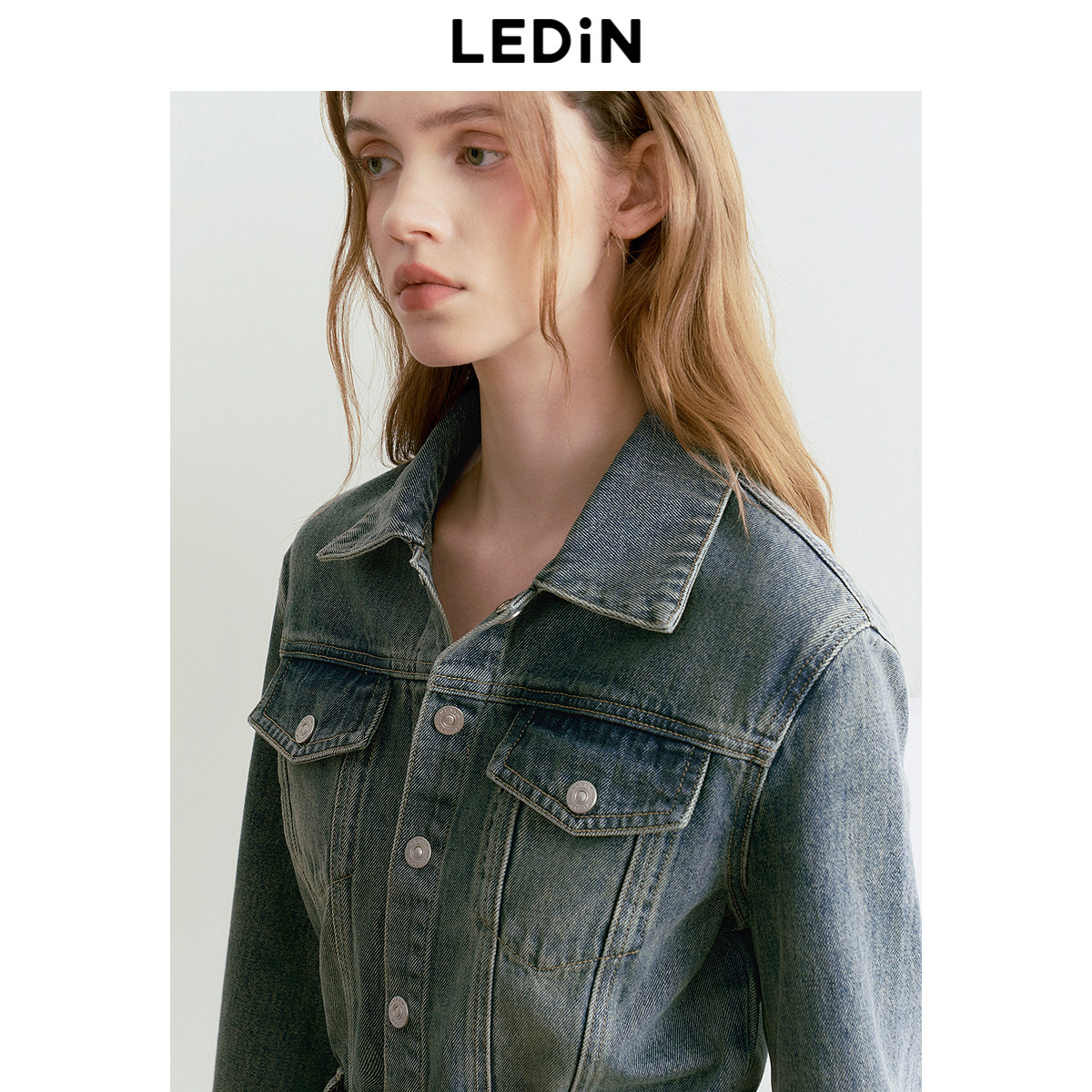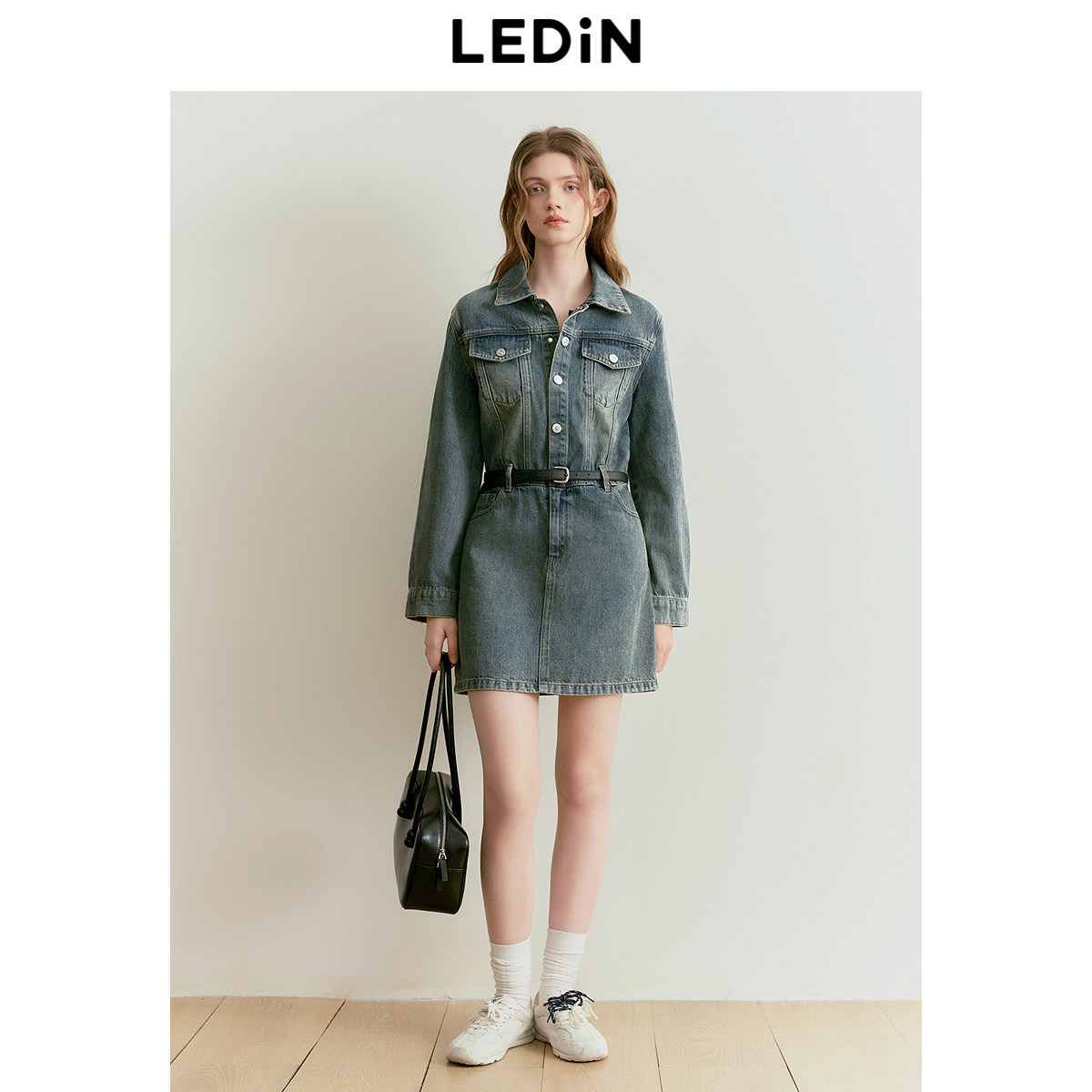 乐町复古水洗长袖牛仔裙女25年春季新款工装风口袋设计休闲连衣裙