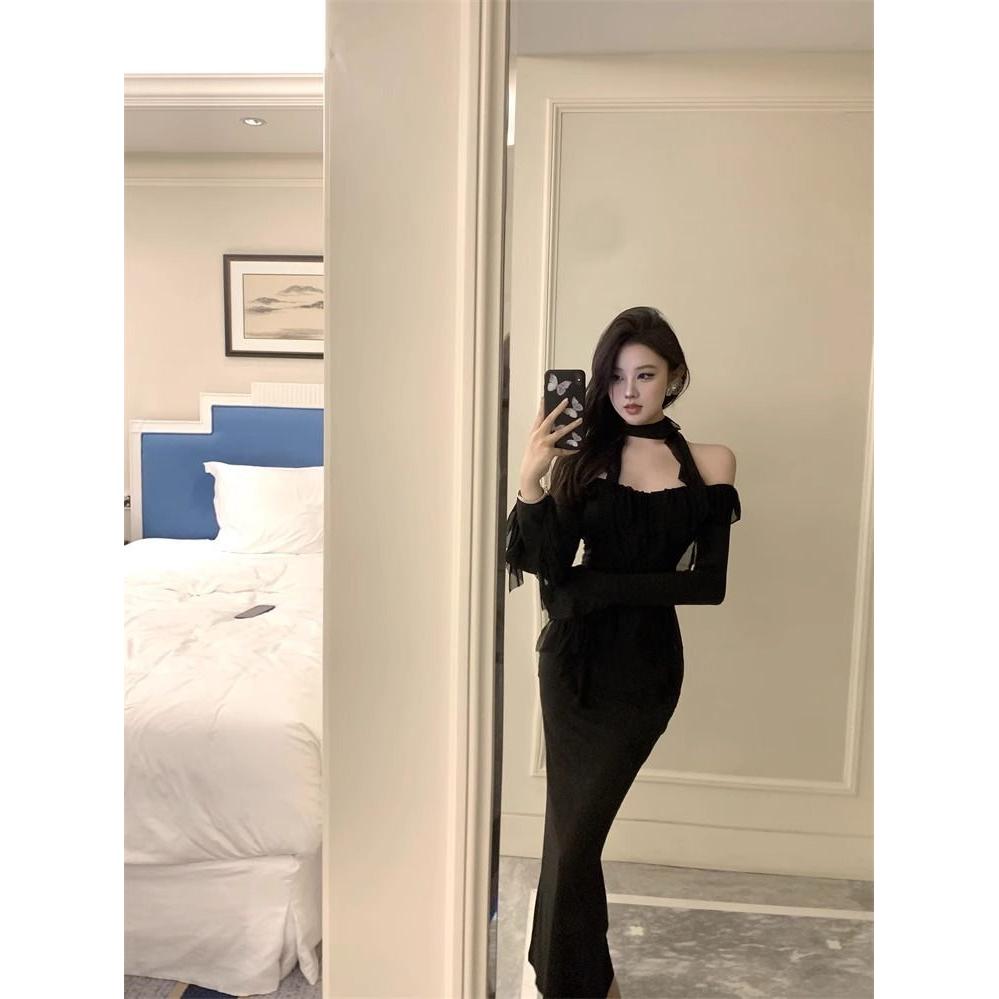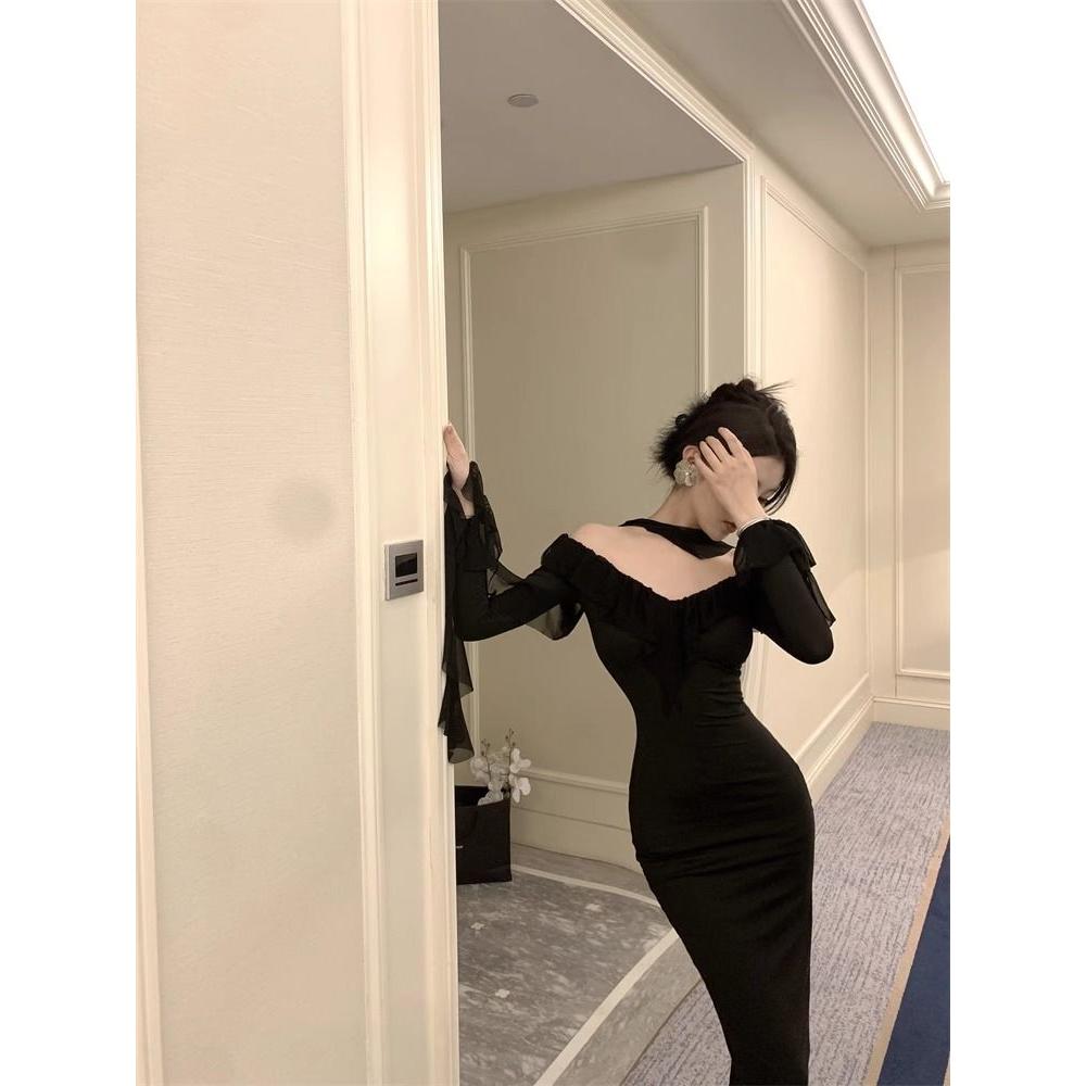 2025新款法式赫本风黑色一字肩连衣裙女春秋高级性感包臀长裙礼服