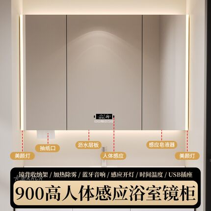 智能感应不锈钢镜柜挂墙式带灯沥水镜子收纳美妆架抽纸定制除雾镜