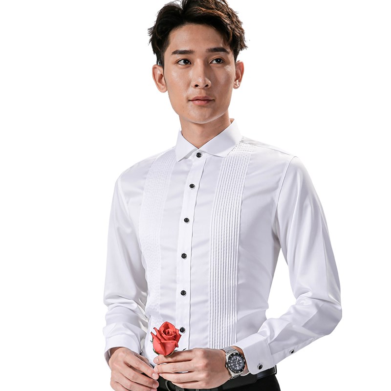结婚衬衫男修身白色礼服衬衫夏季伴郎服婚礼演出新郎白色衬衣男士