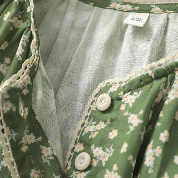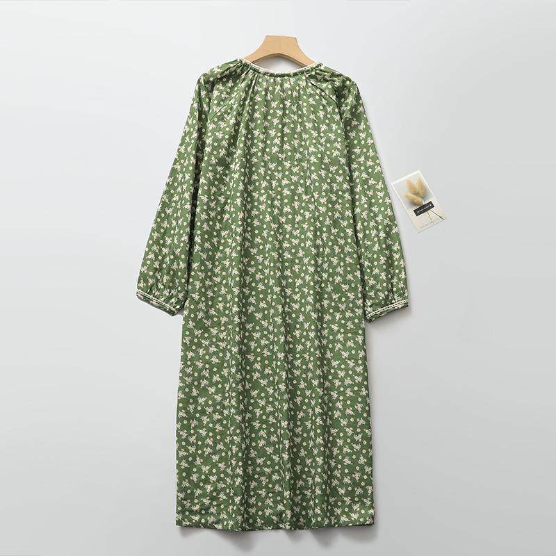 森系田园碎花长袖睡裙女生纯棉纱文艺蕾丝边圆领家居连衣裙可外穿