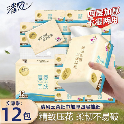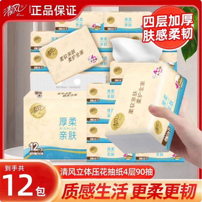 清风抽纸云柔压花4层90抽S码餐巾纸家用纸抽取式卫生纸实惠软包装