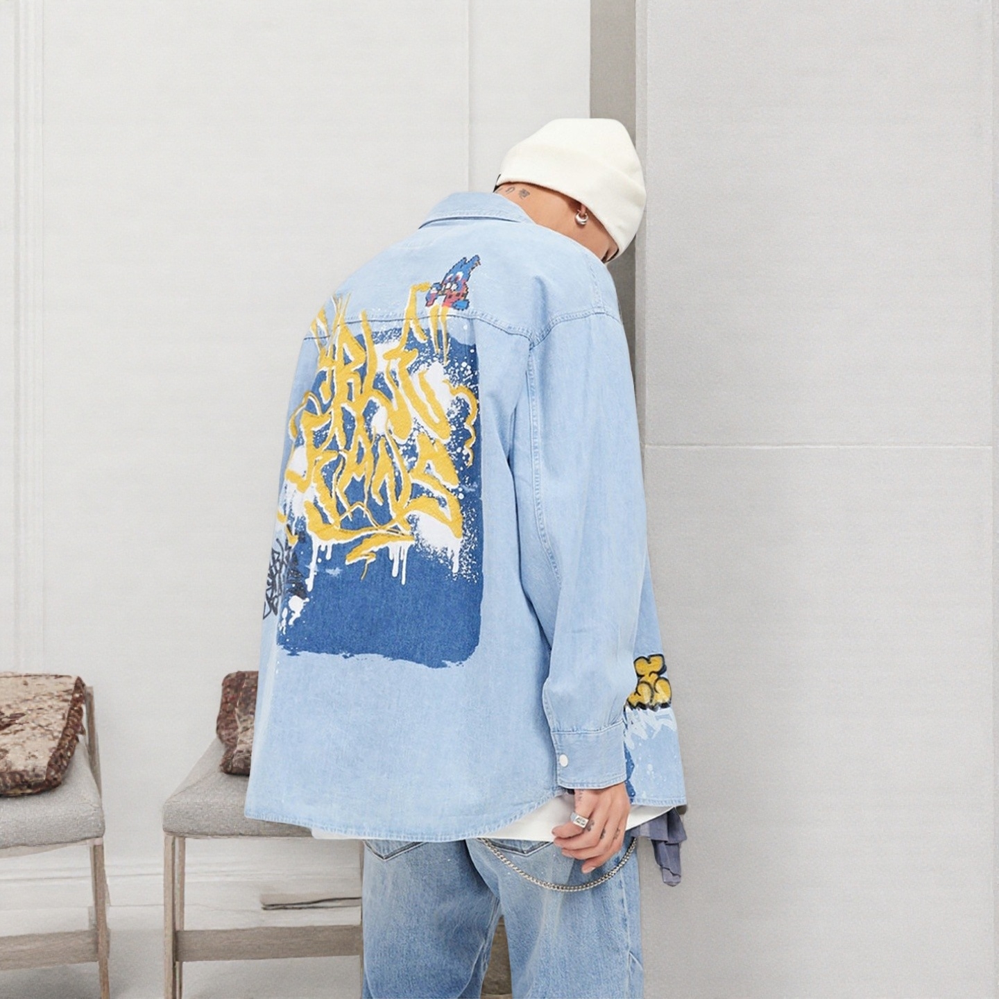 潮流涂鸦印花男宽松长袖牛仔衬衫