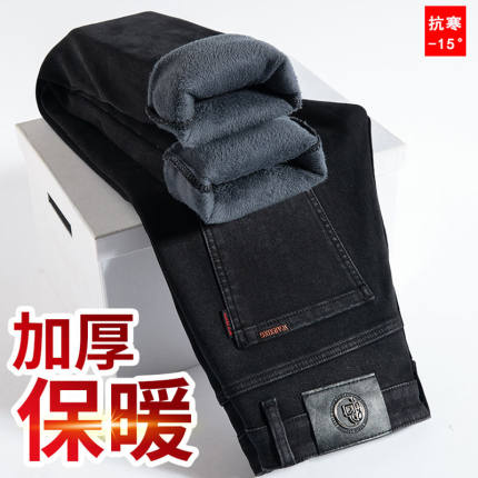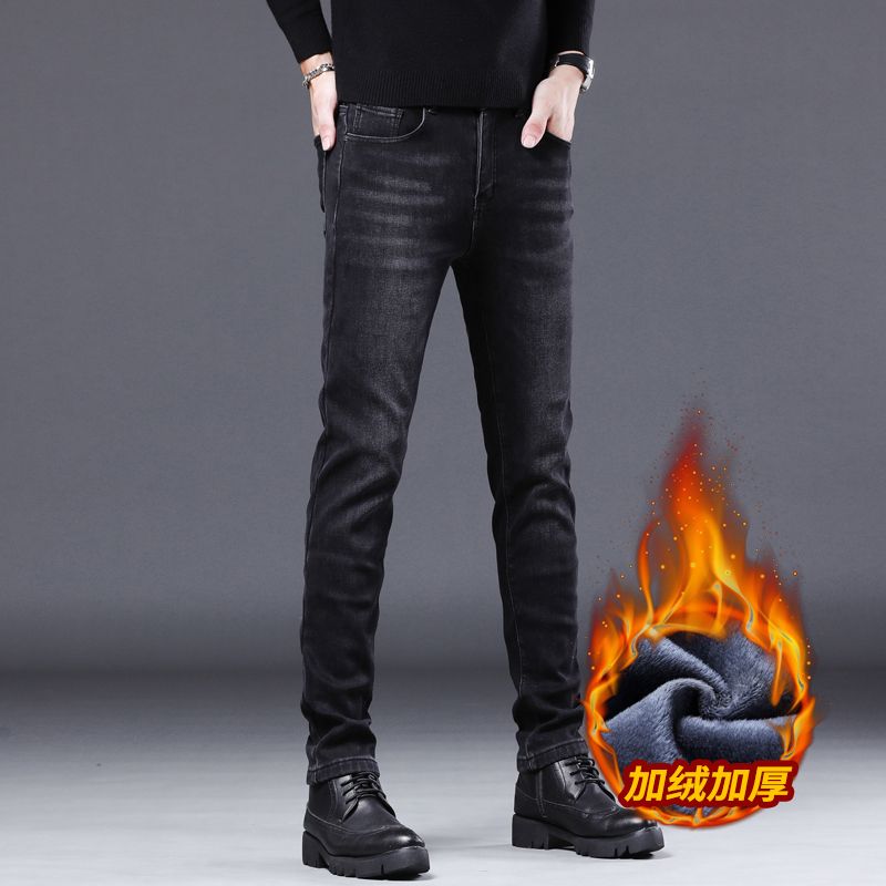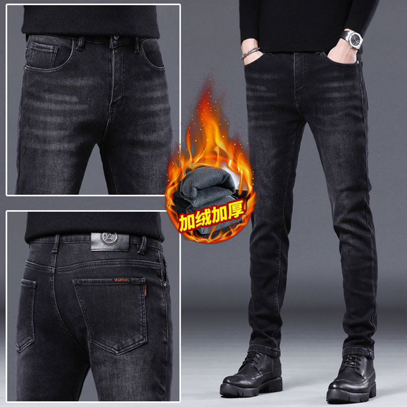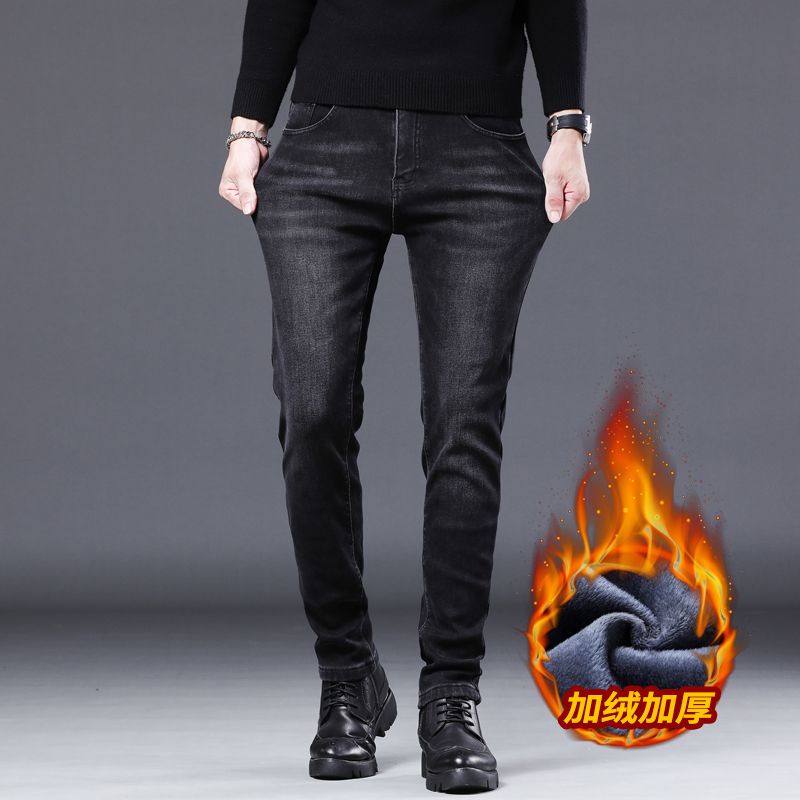 冬季加绒加厚男士牛仔裤2024新款修身小脚裤秋冬保暖黑色休闲长裤