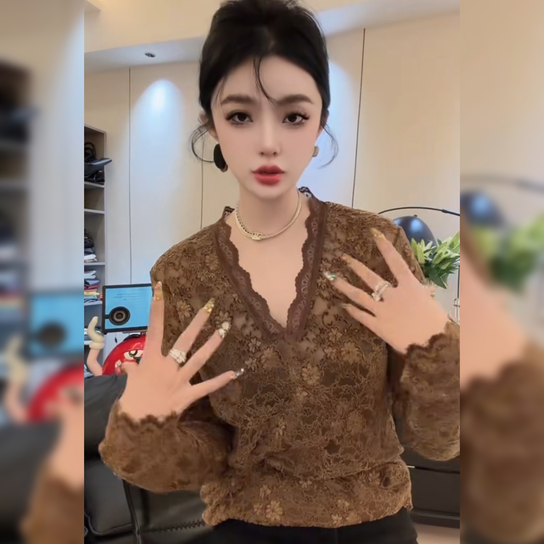 欧货高端重工蕾丝拼接丝绒打底衫女秋冬新洋气内搭长袖性感V领