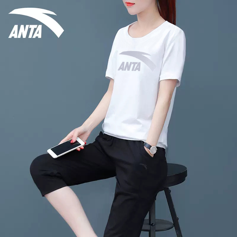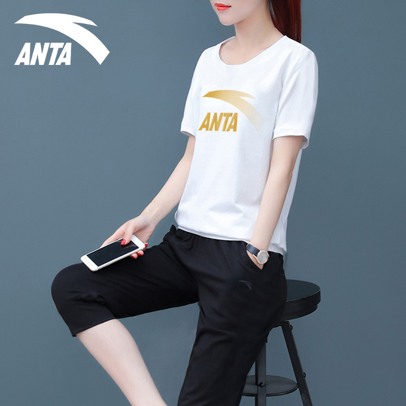 安踏运动套装女装夏季2025新款修身圆领透气短袖速干七分裤两件套