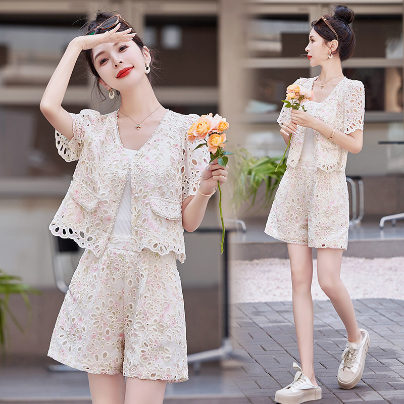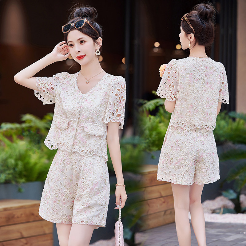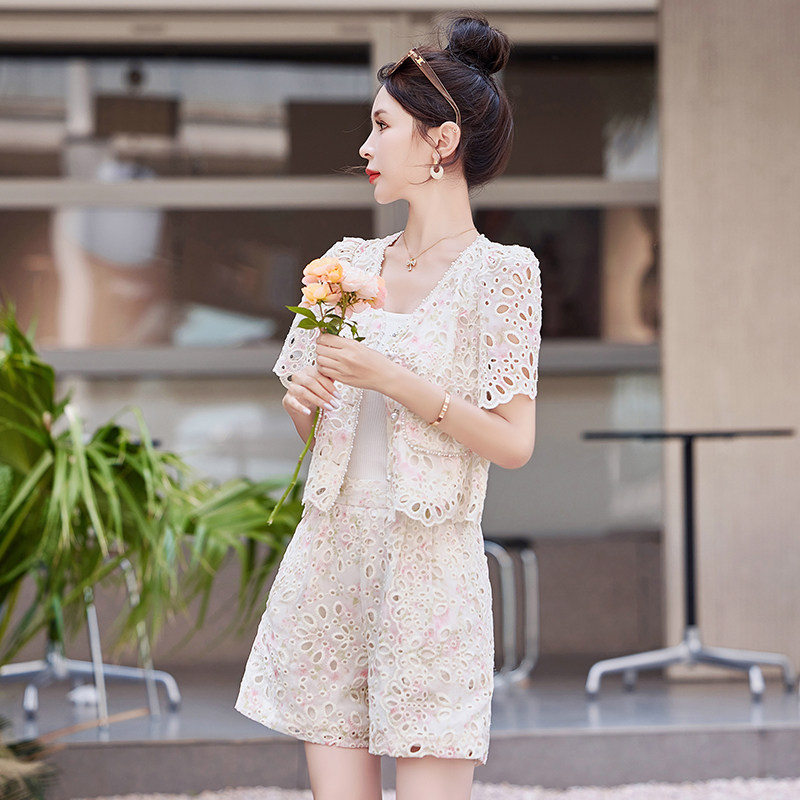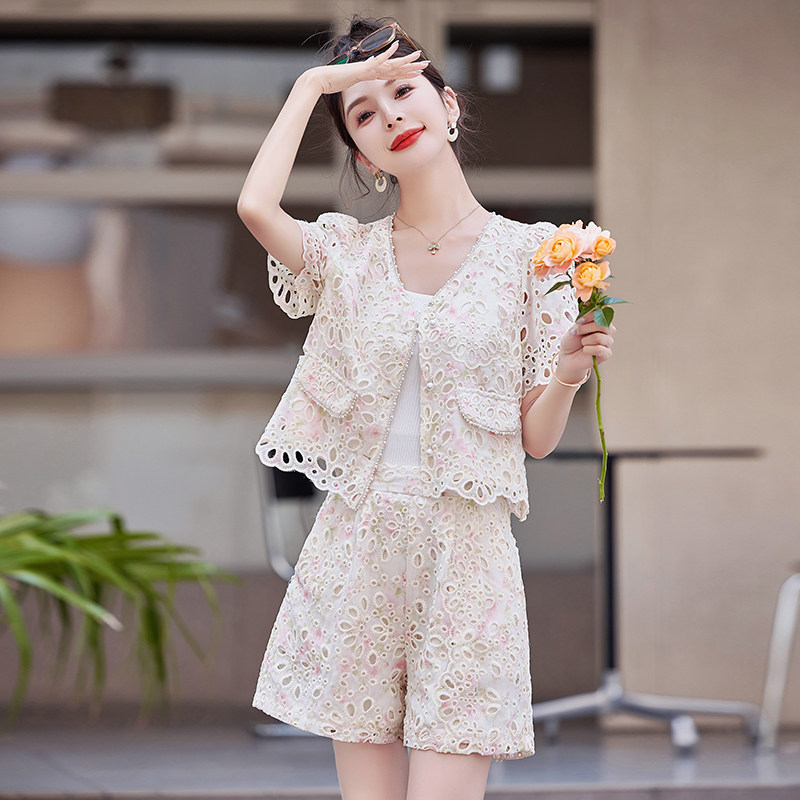 时尚小香风短裤套装女夏季2025年新款小个子名媛镂空蕾丝两件套