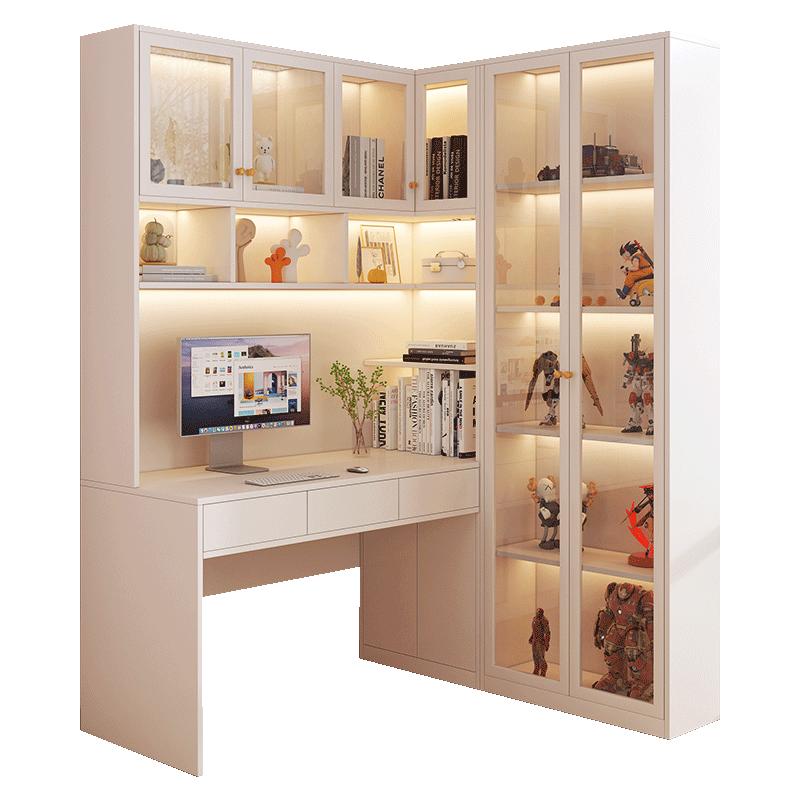 实木书桌书柜一体桌卧室奶油风家用书房转角L型电脑桌子书架组合