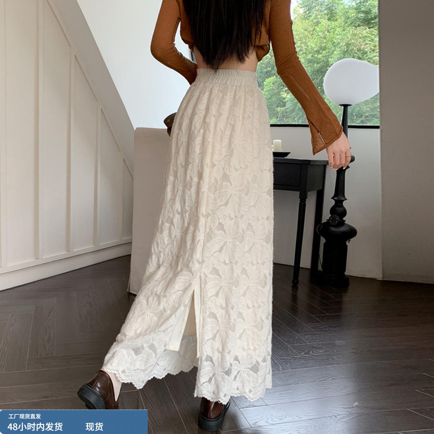 法式浪漫风蕾丝半身裙女秋冬款加绒高腰开叉A字长裙花边直筒裙子