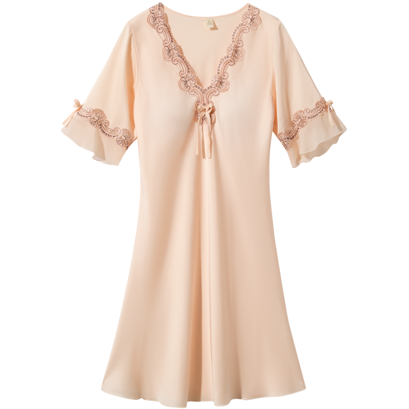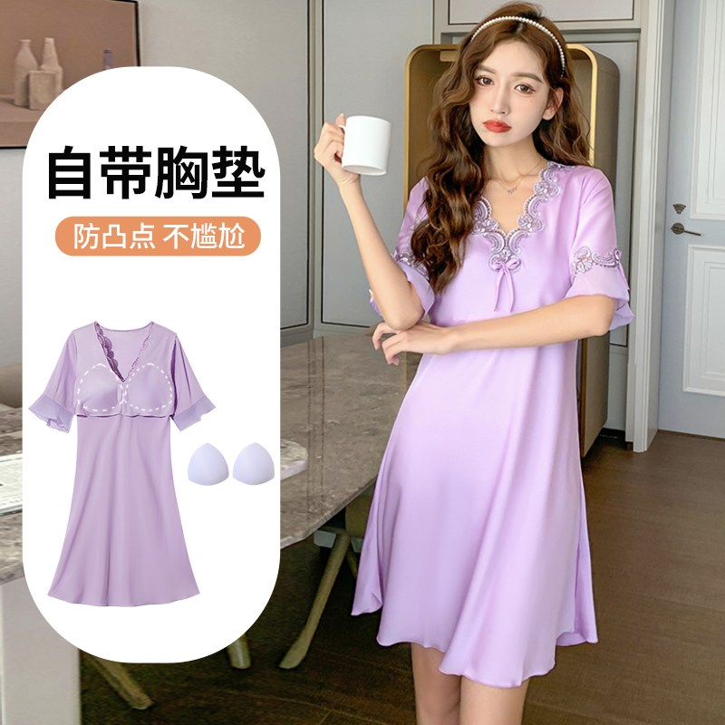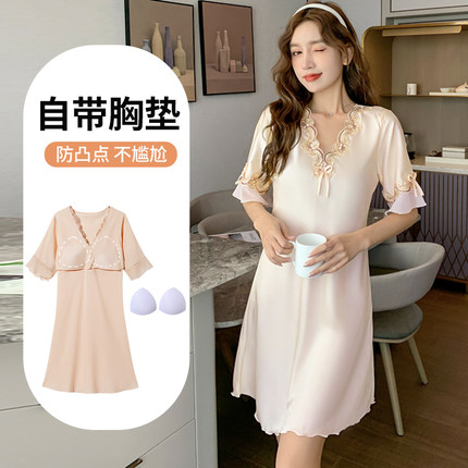 自带胸垫冰丝短袖睡裙女夏季薄款带Bra丝绸连衣裙性感睡衣家居服