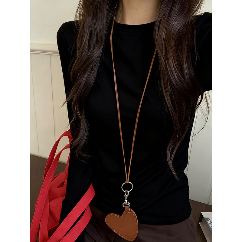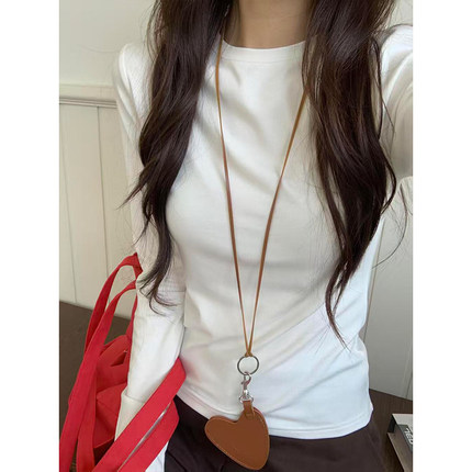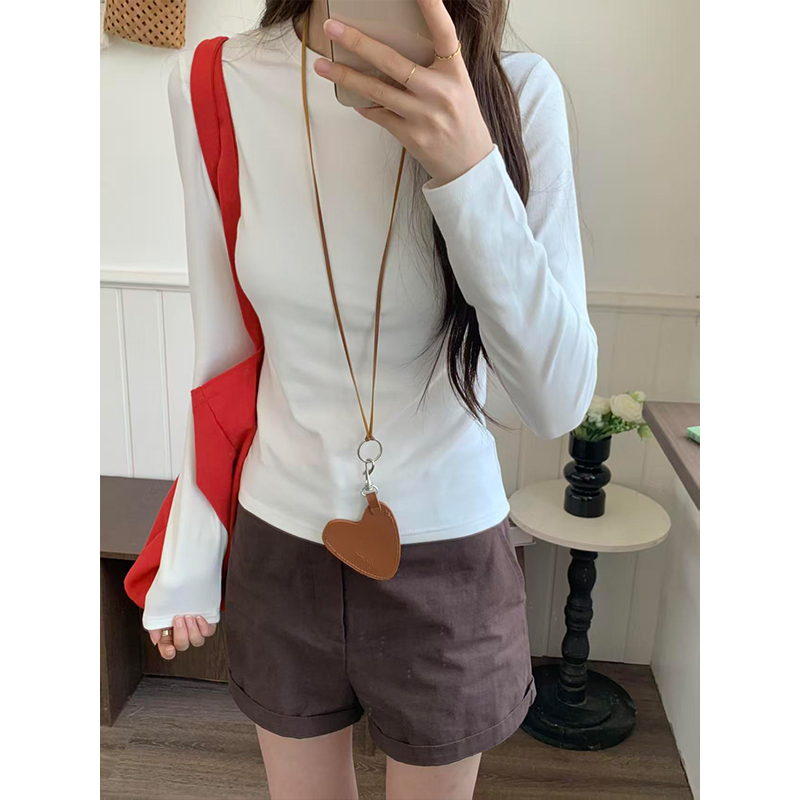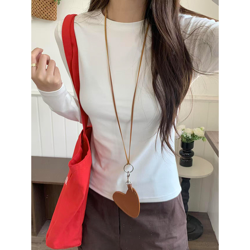 正肩圆领长袖T恤女春秋内搭短款打底衫修身显瘦上衣简约百搭体恤
