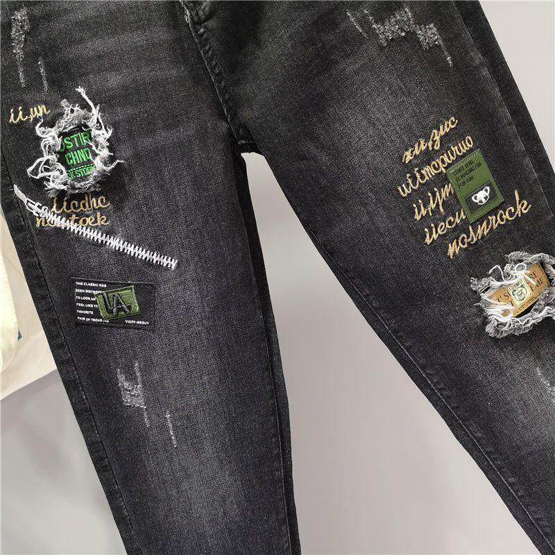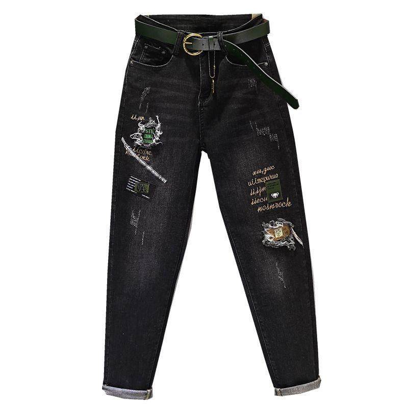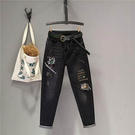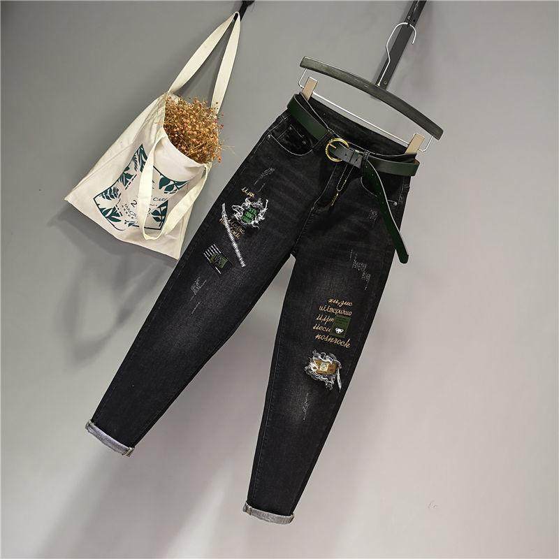欧货重工刺绣假破洞牛仔哈伦裤女秋冬加厚九分裤加薄绒老爹裤垮裤