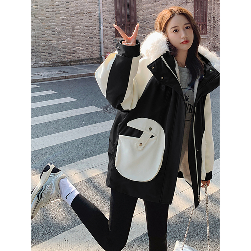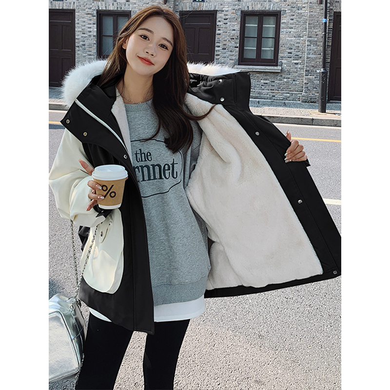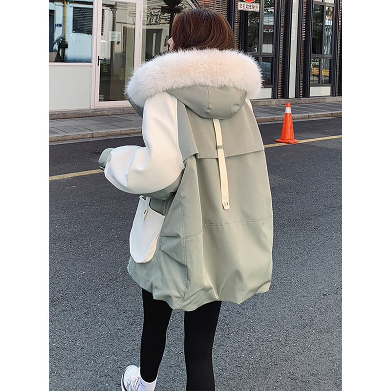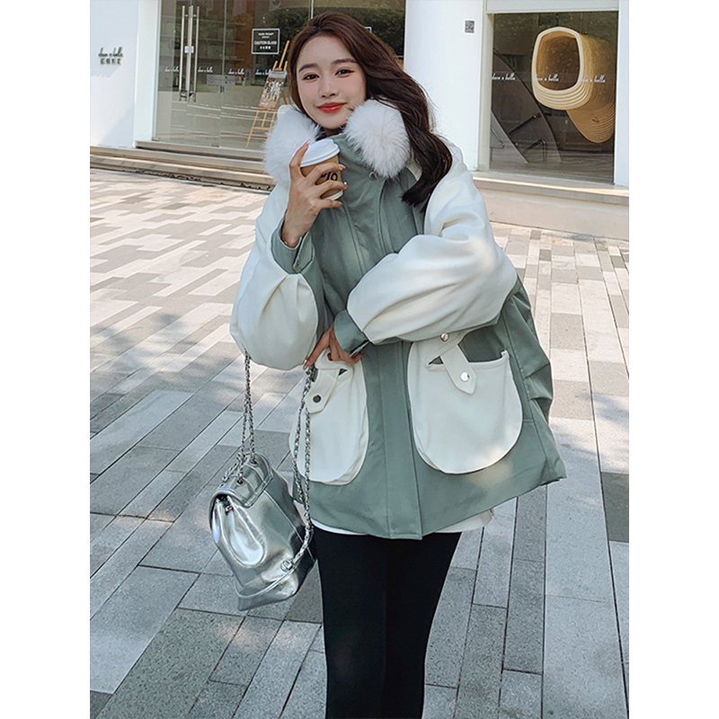大码女装豆绿色大毛领工装派克棉服女胖mm高级感加绒加厚显瘦外套