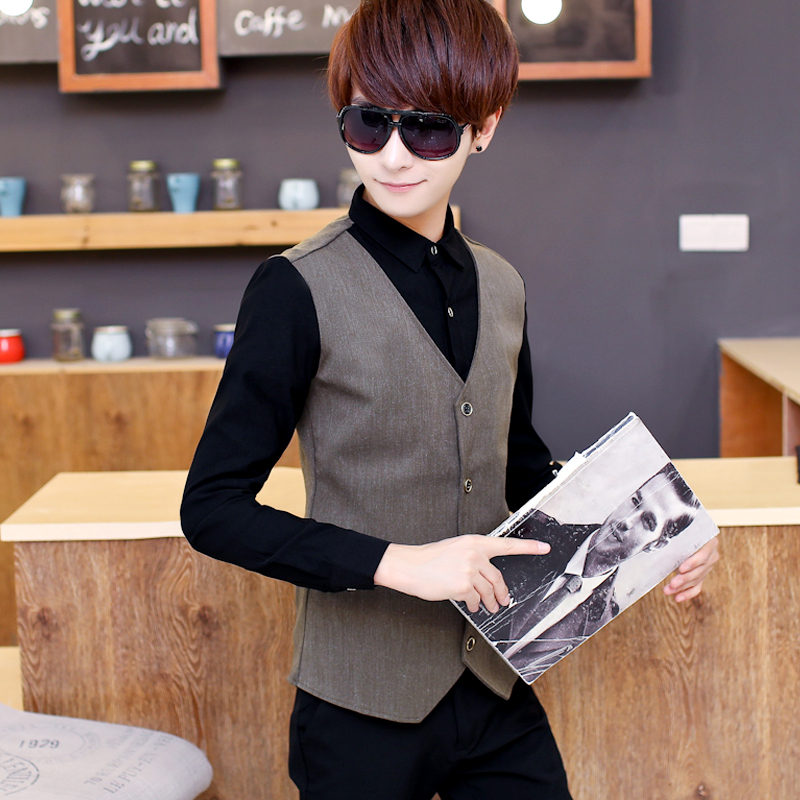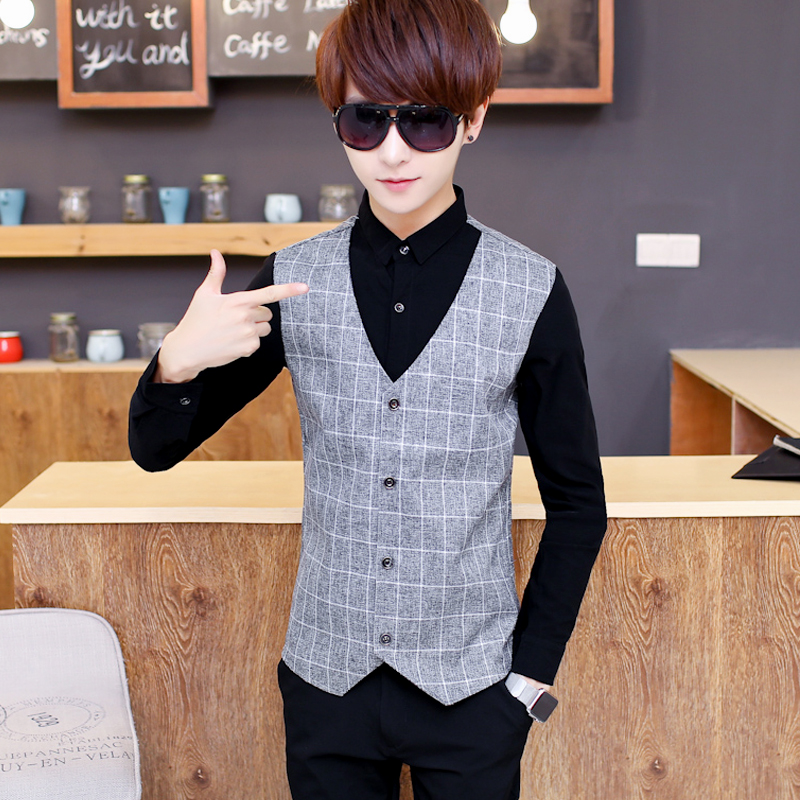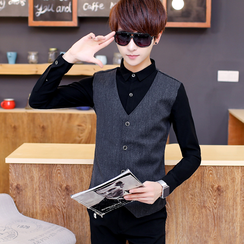 长袖衬衫男士春秋季韩版修身寸衫潮流马甲一体男装帅气假两件衬衣