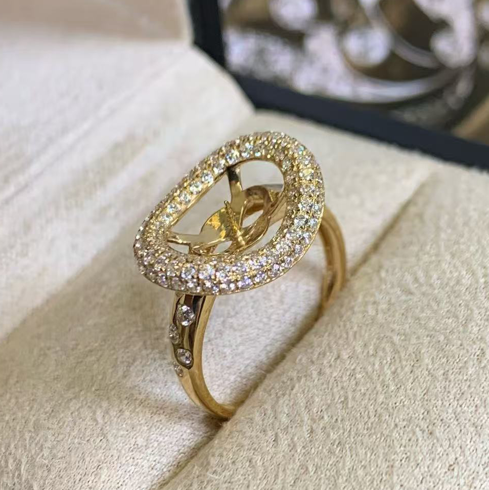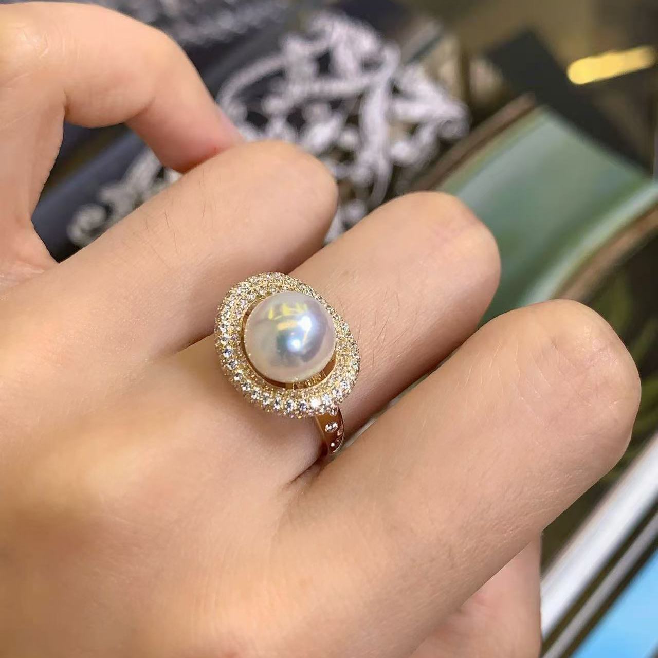 18K金锆石8-9mm淡水珍珠戒指配件重工招财元宝款裸珠diy底托空托