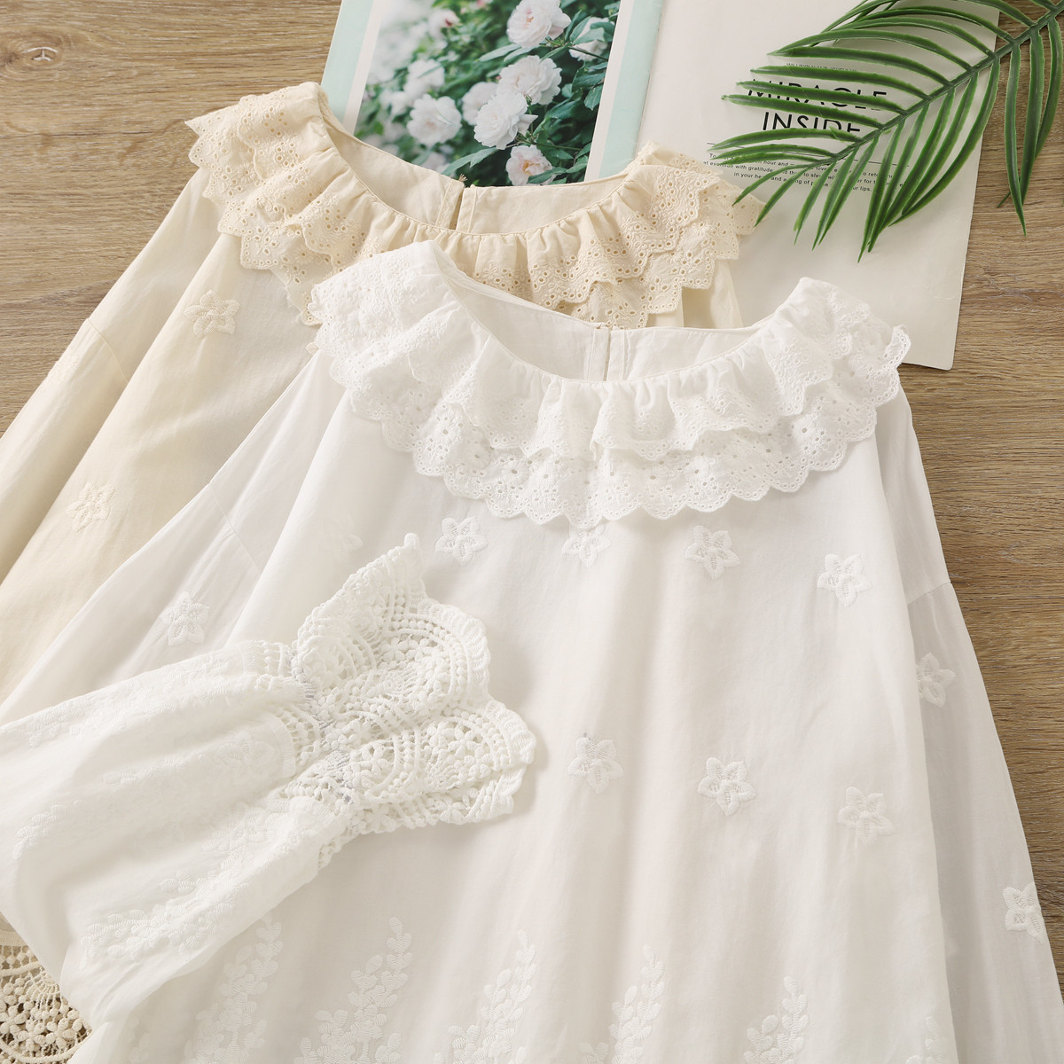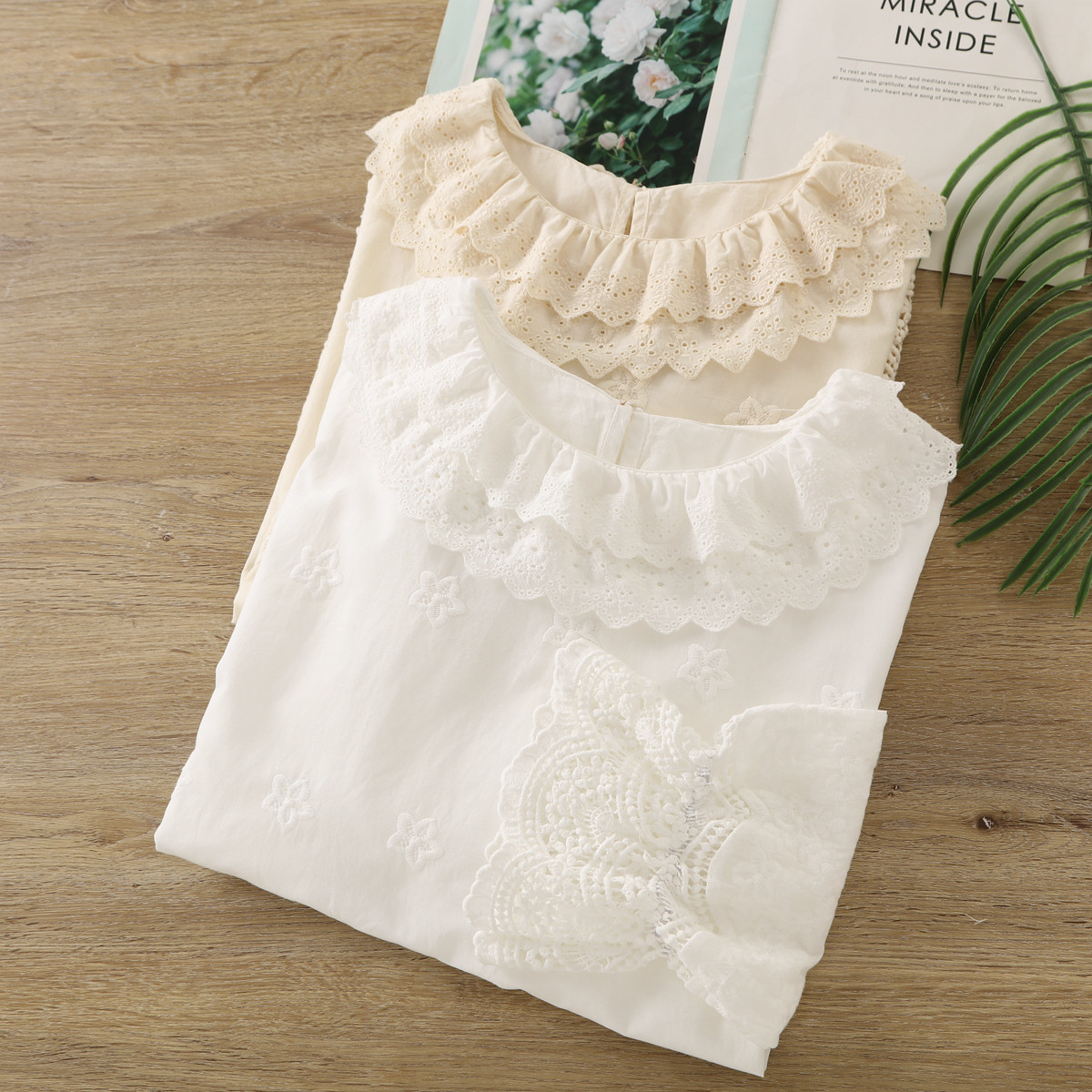 甜美双层荷叶边娃娃领长袖衬衫女森系设计感小众镂空袖文艺上衣春