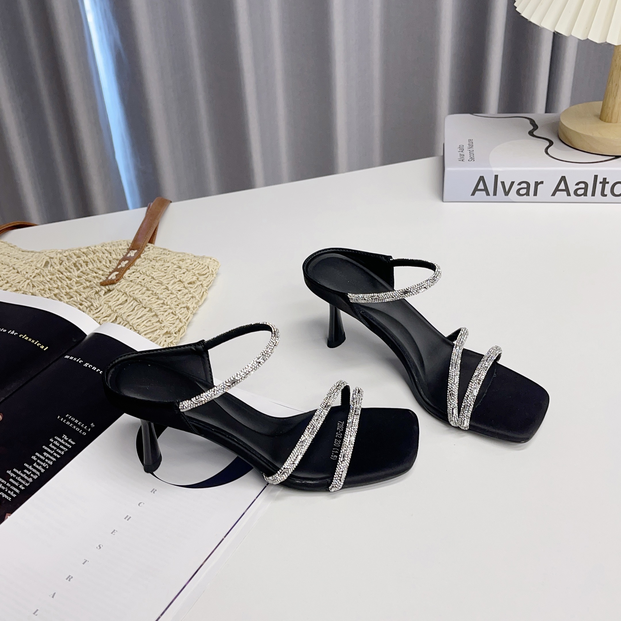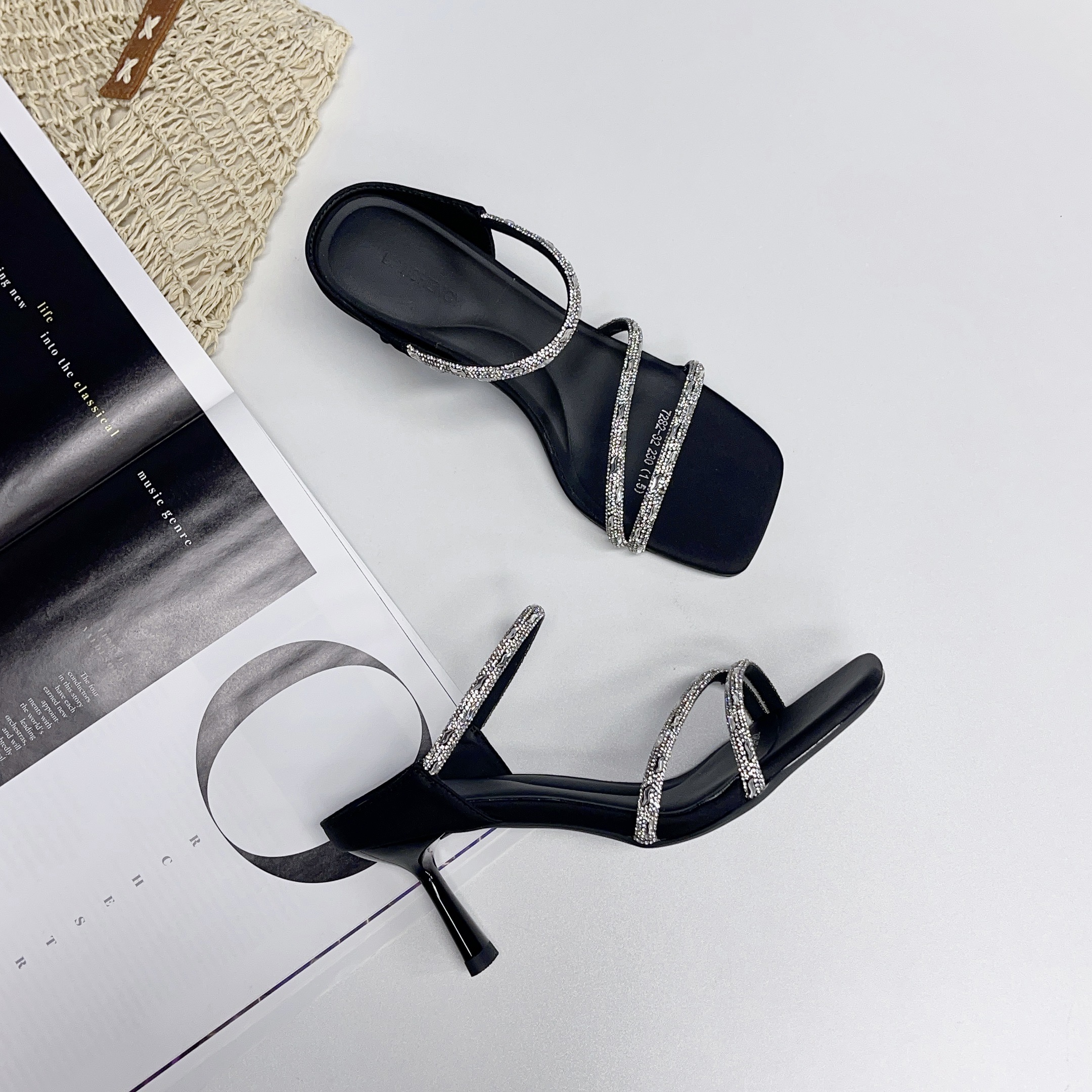 水钻凉鞋女气质名媛细跟高跟鞋黑色2025年新款夏季时尚百搭女凉鞋