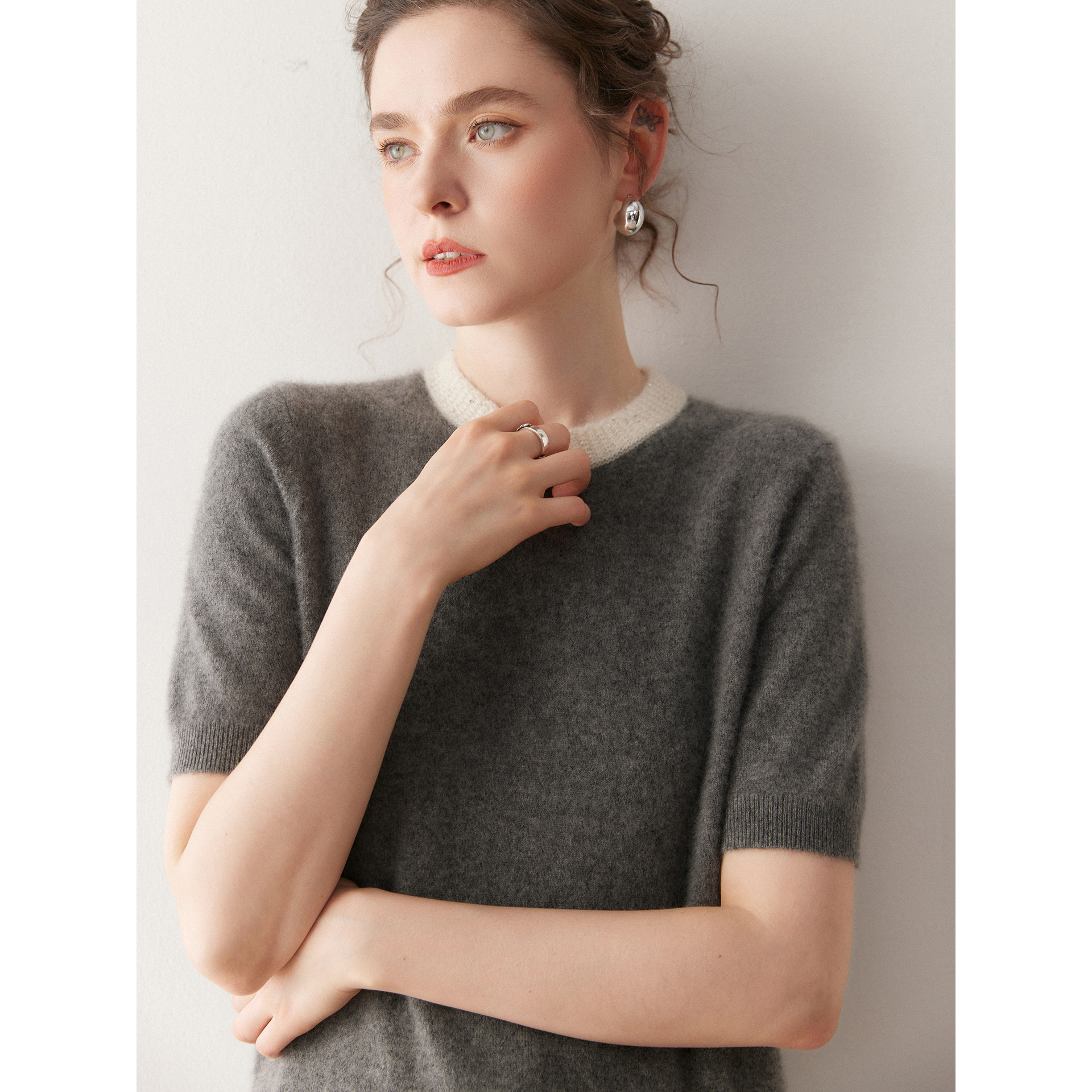 2025秋冬亮片圆领拼色山羊绒衫女短袖套头针织打底衫中袖毛衣软糯