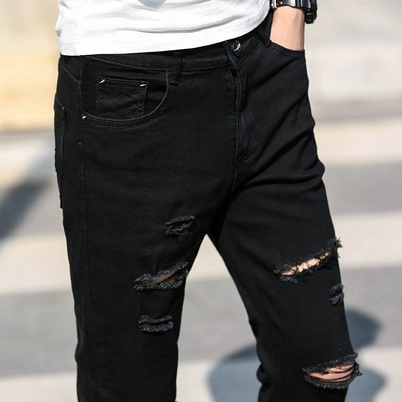 夏季薄款潮牌时尚黑色多破洞牛仔9九分长裤男生修身小脚潮流显瘦