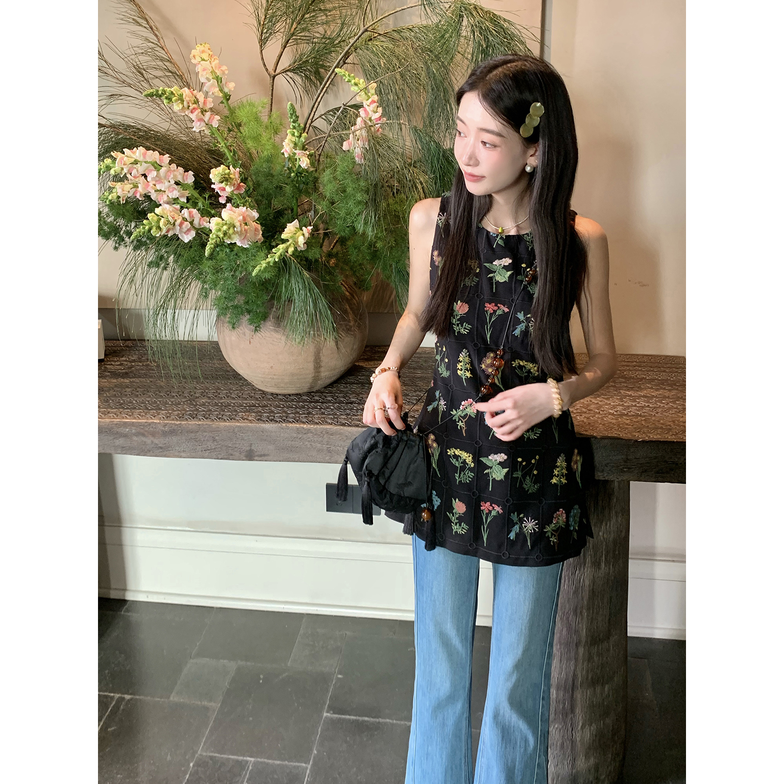 Thecoco 植物刺绣黑色旗袍套组女夏季重工气质上衣短裤搭配一整套