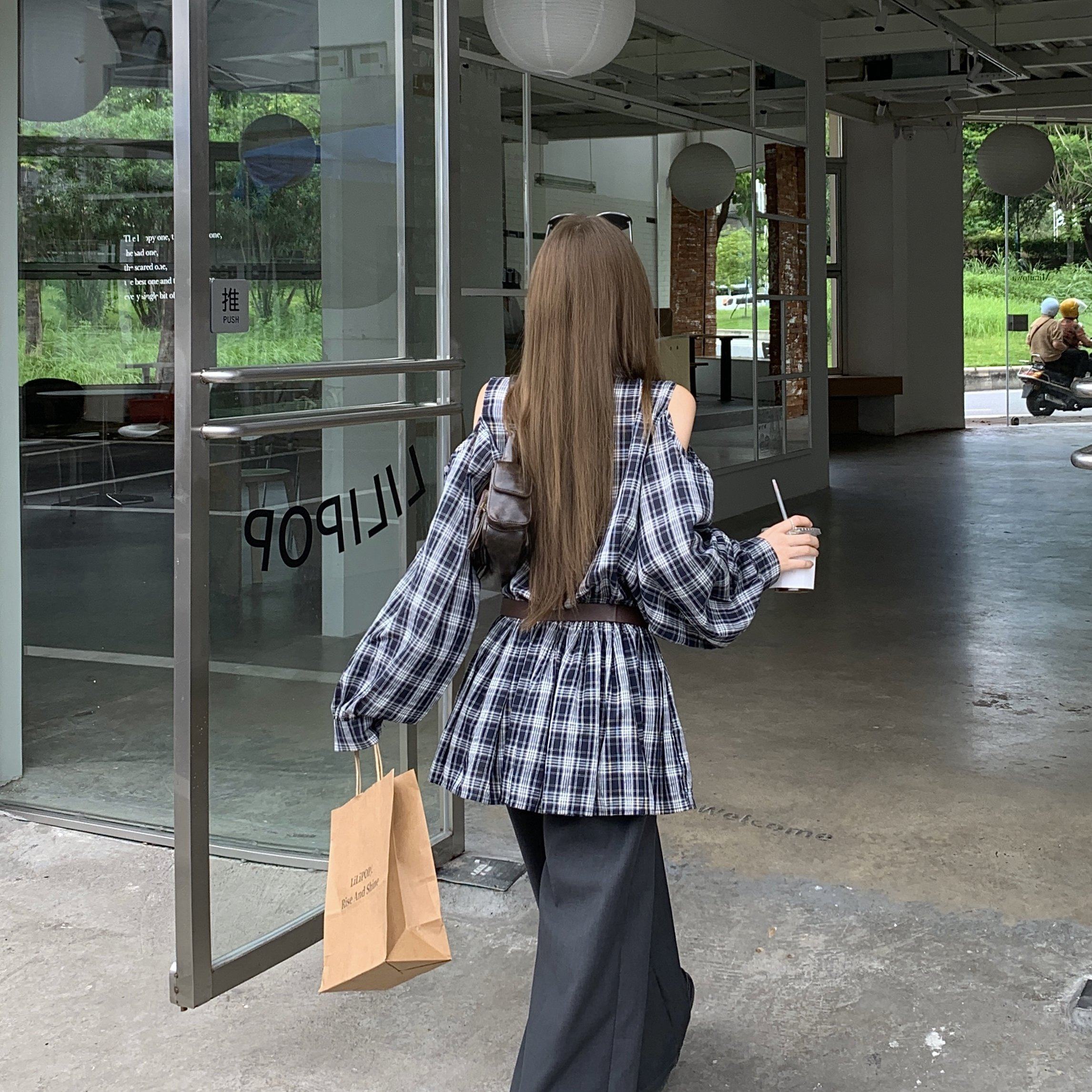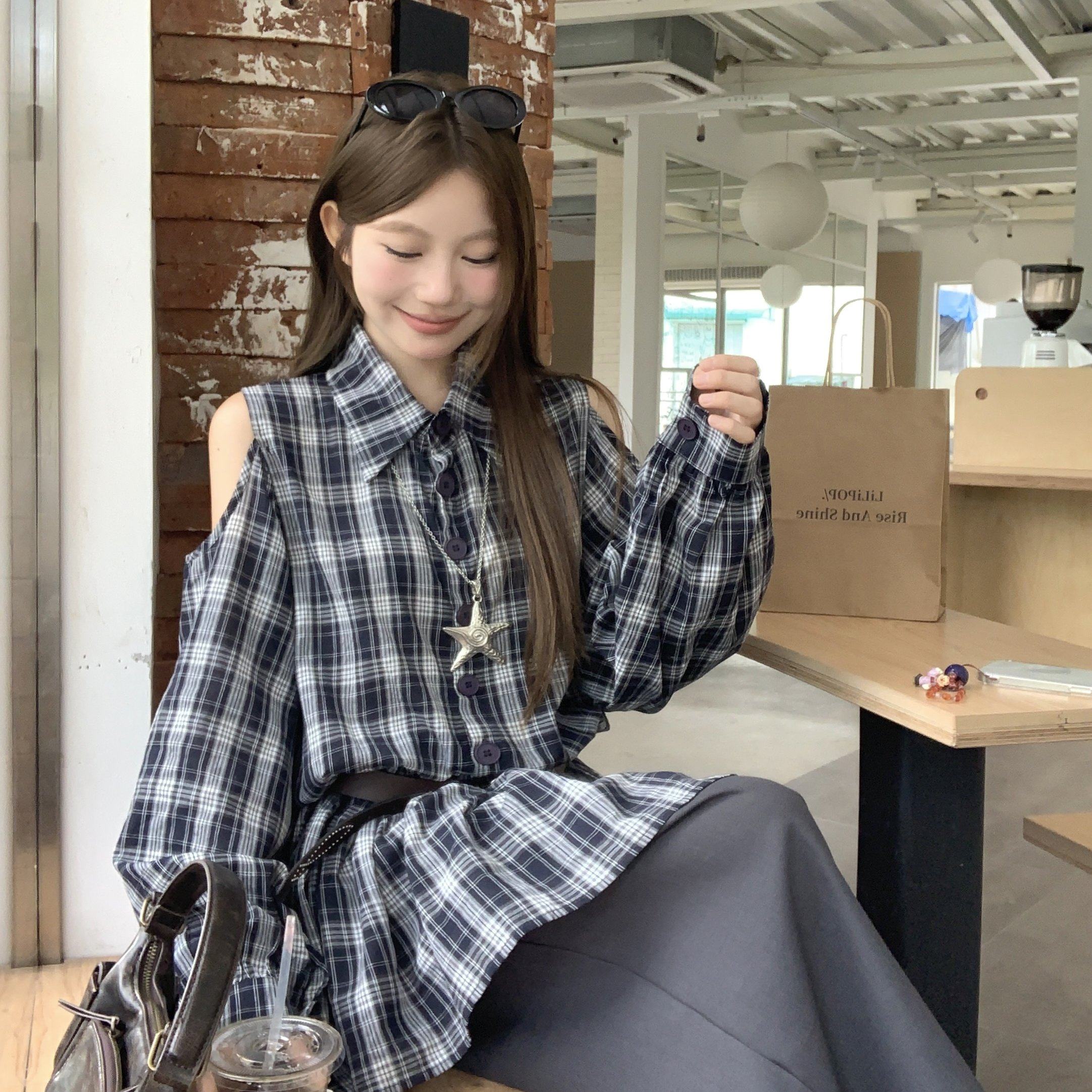 实拍实价时尚Polo领收腰设计感镂空露肩修身显瘦衬衫连衣裙女