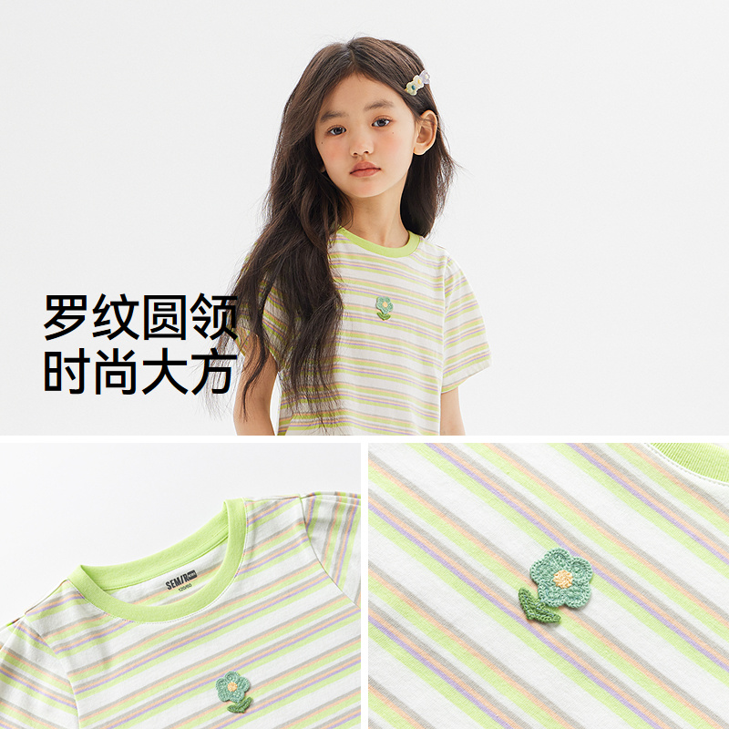 森马儿童短袖T恤2024新款时尚经典撞色条纹甜美可爱上衣女童夏装