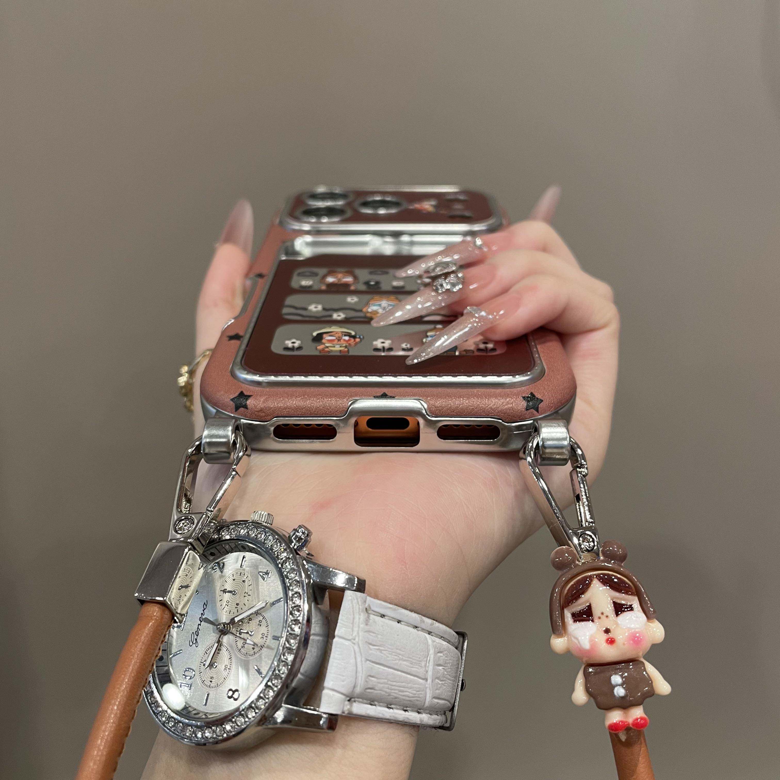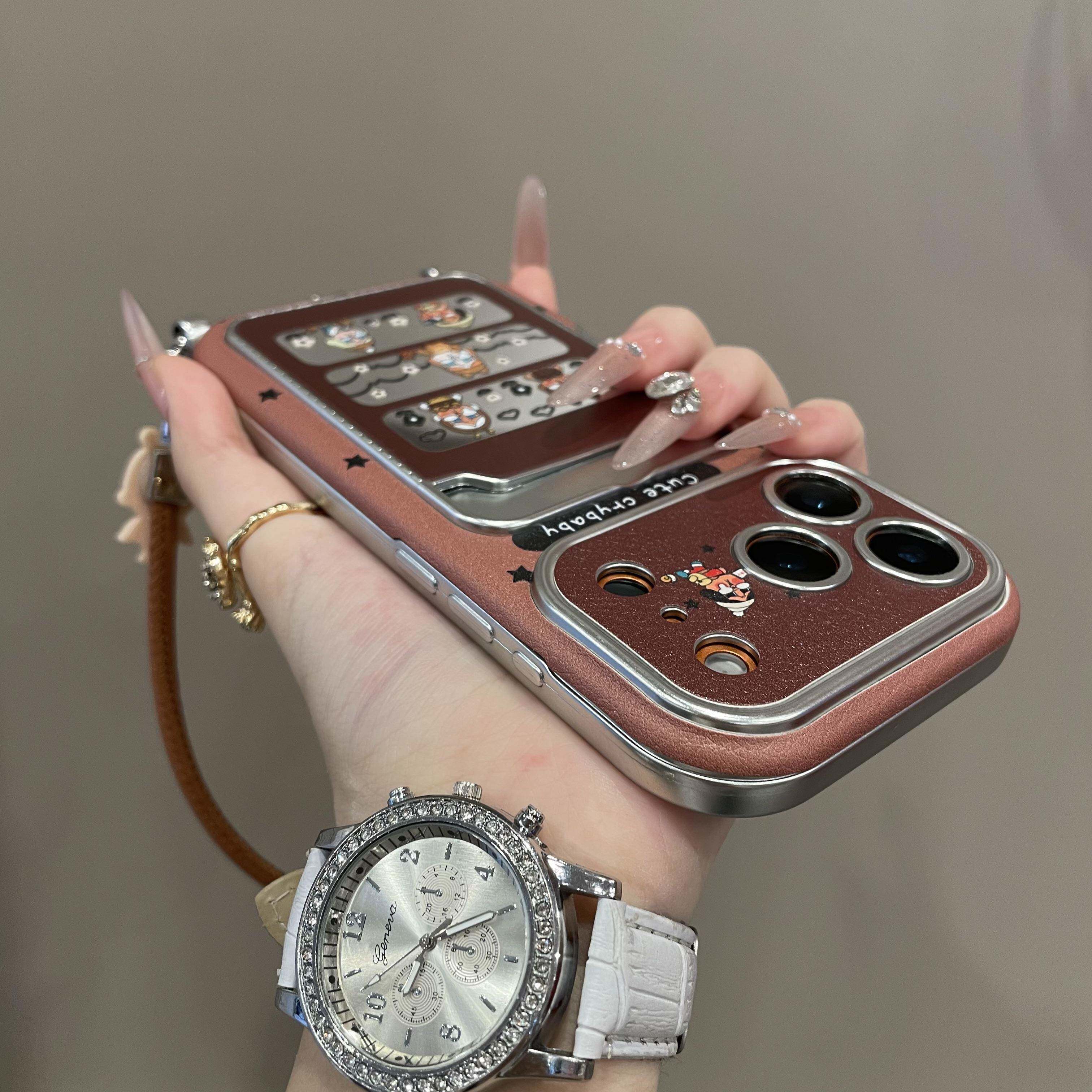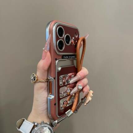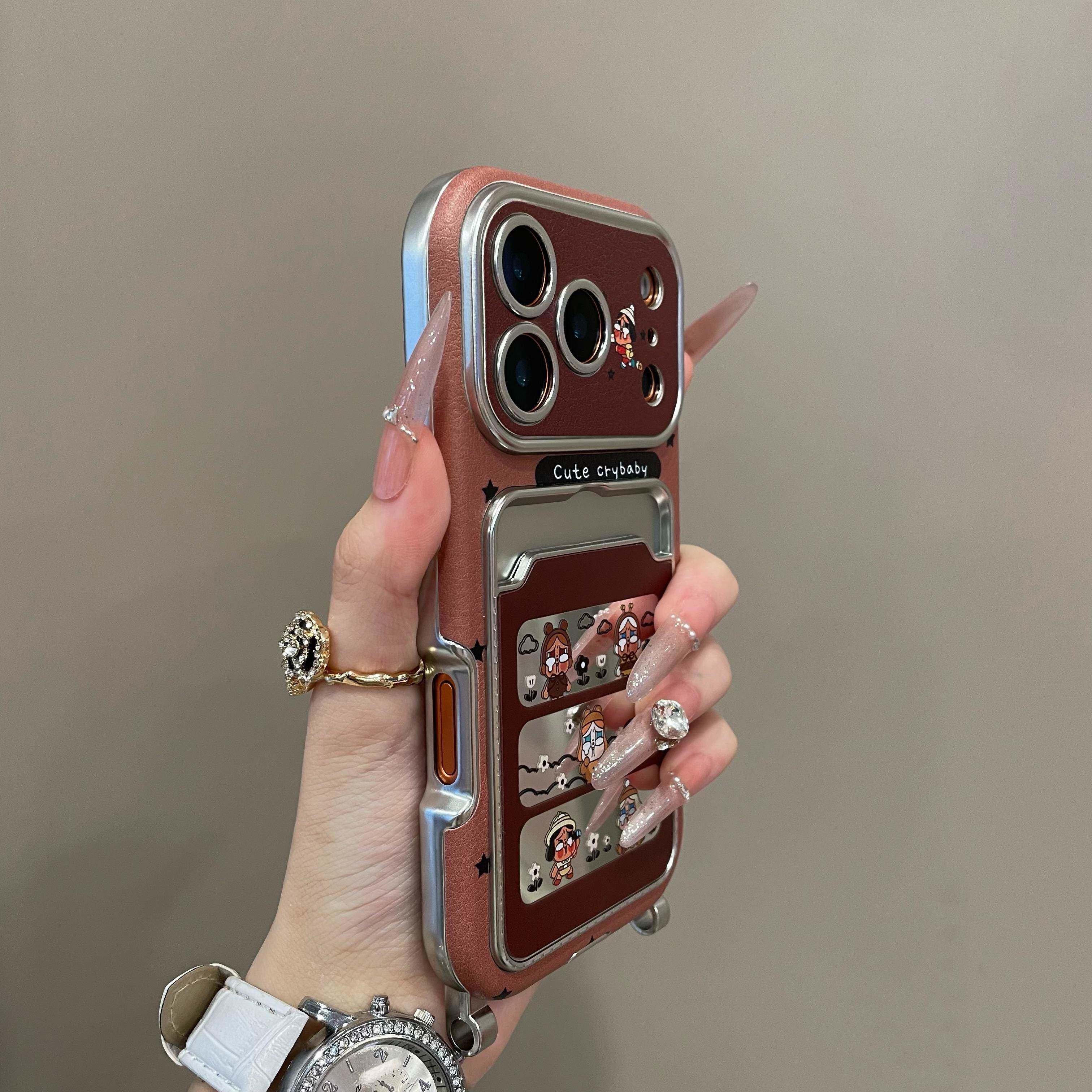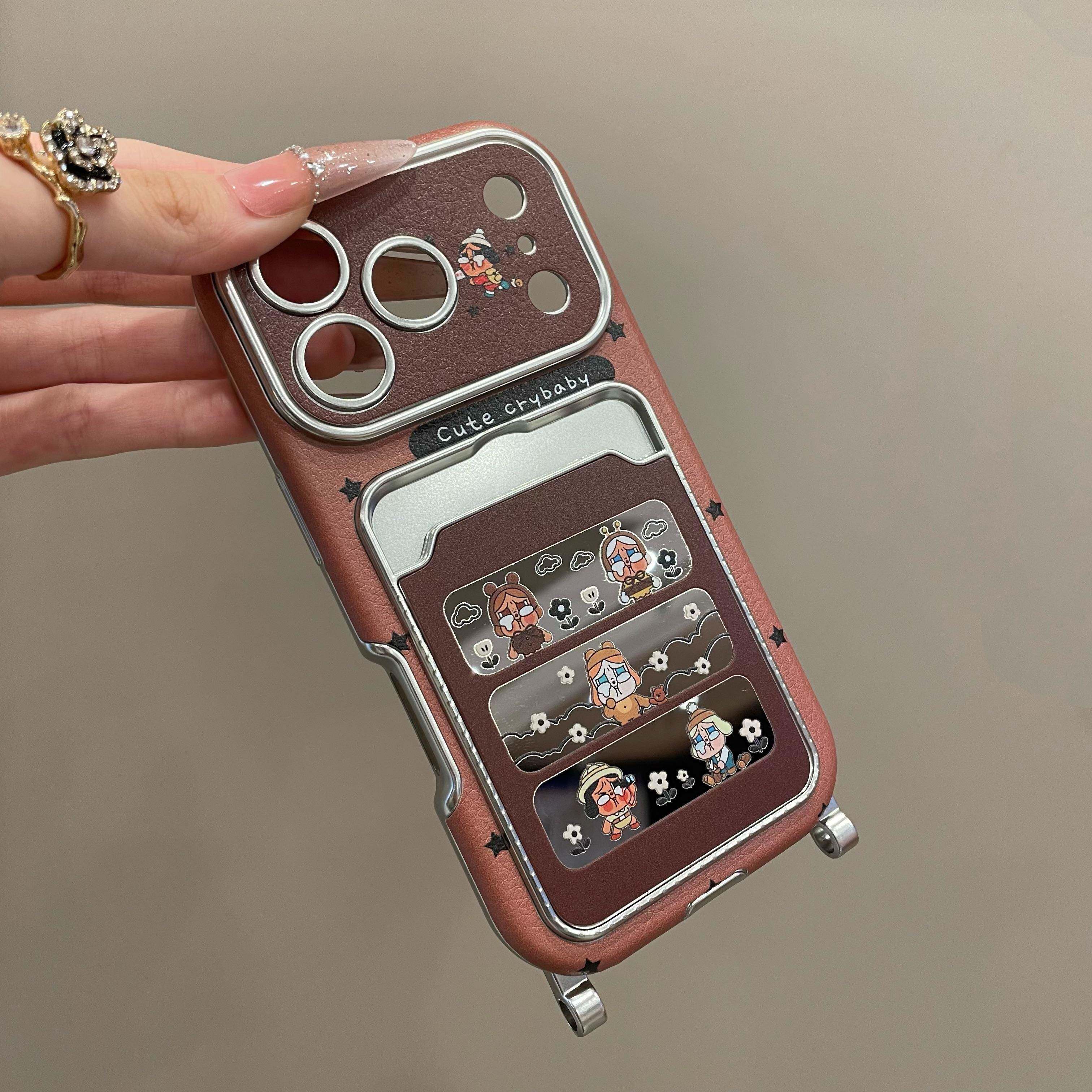 卡通棕底花朵哭娃镜面卡包适用iPhone17promax手机壳15新款17pro网红女款13创意全包防摔16pro超好看17保护套
