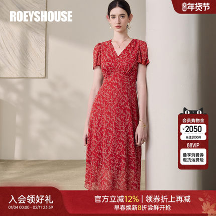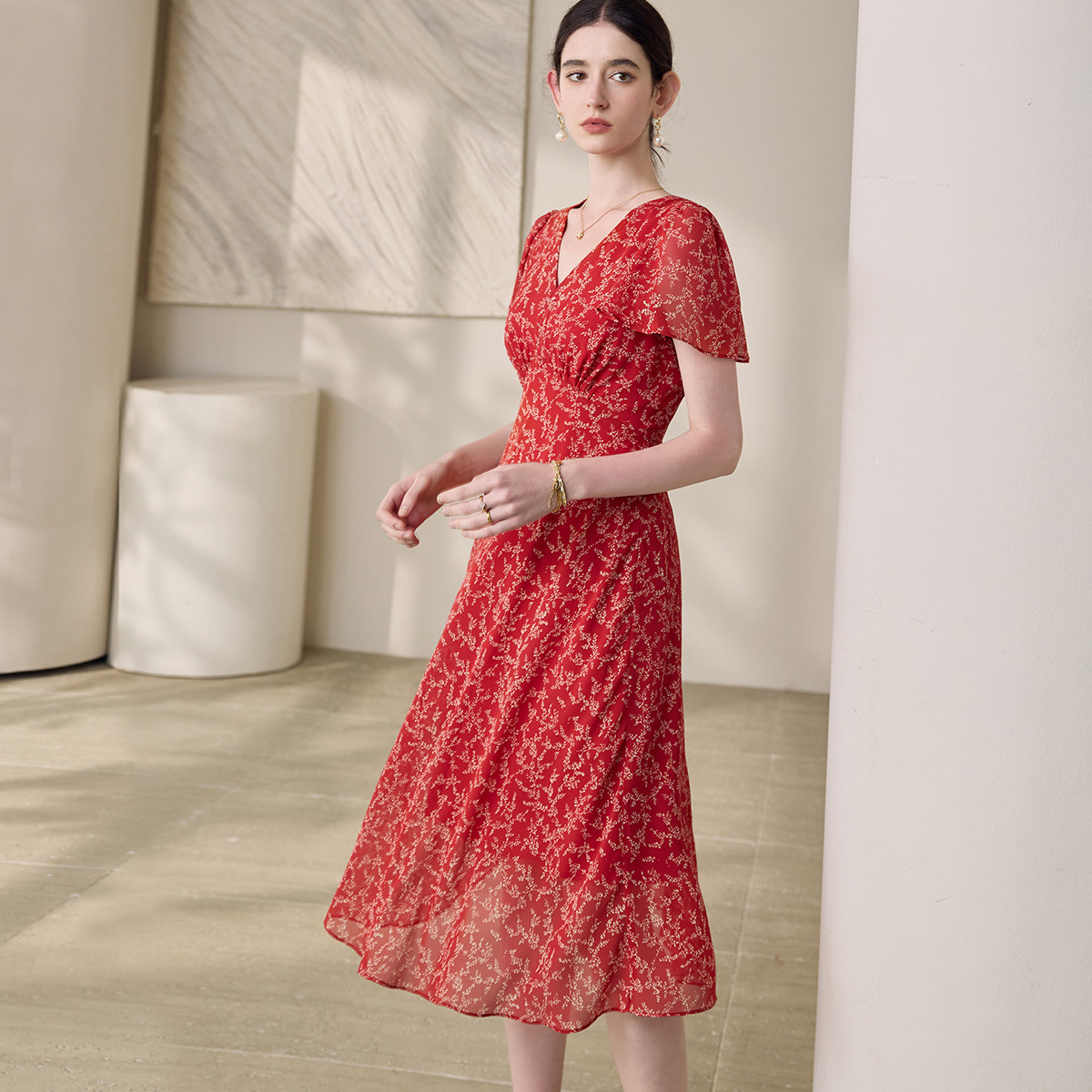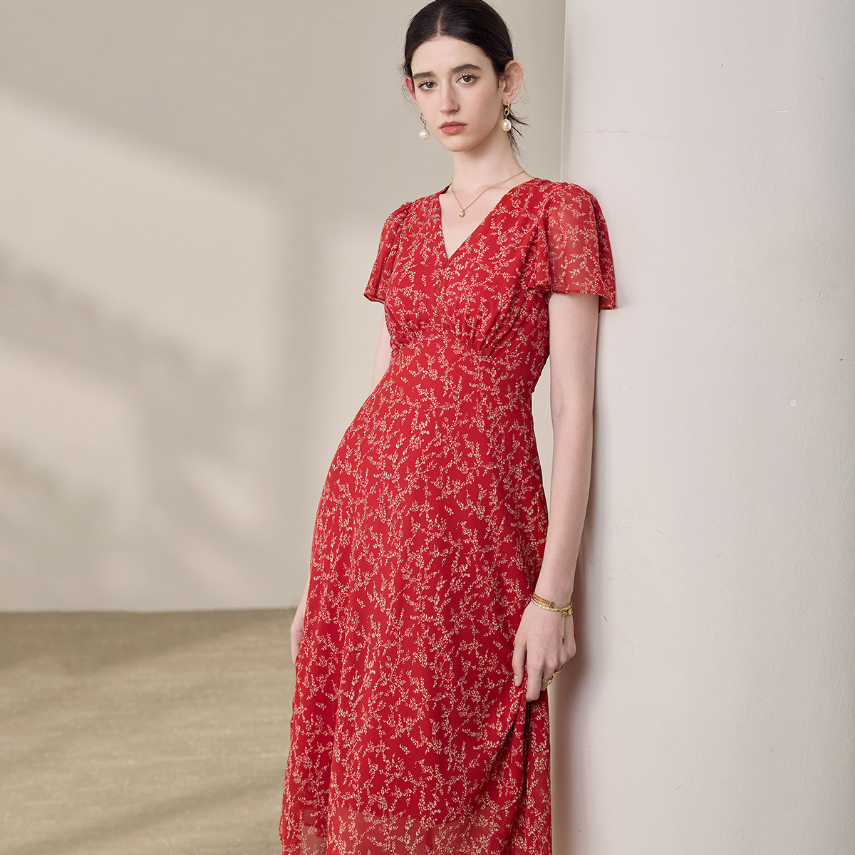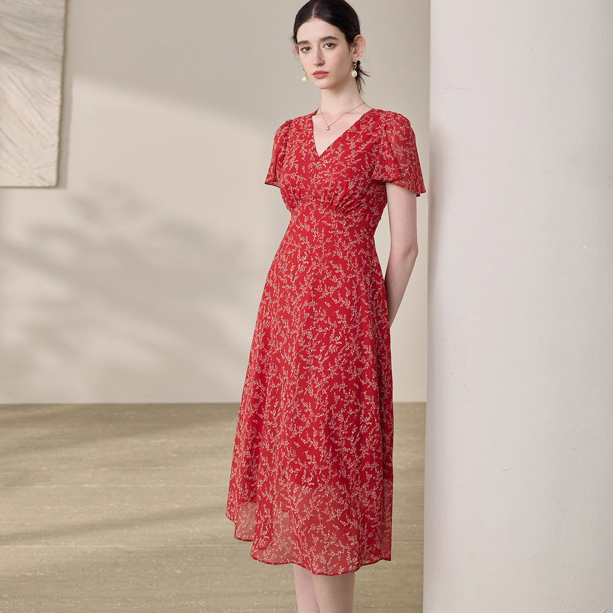 罗衣优雅V领大摆连衣裙2025夏季新款气质红色碎花收腰中长裙11943