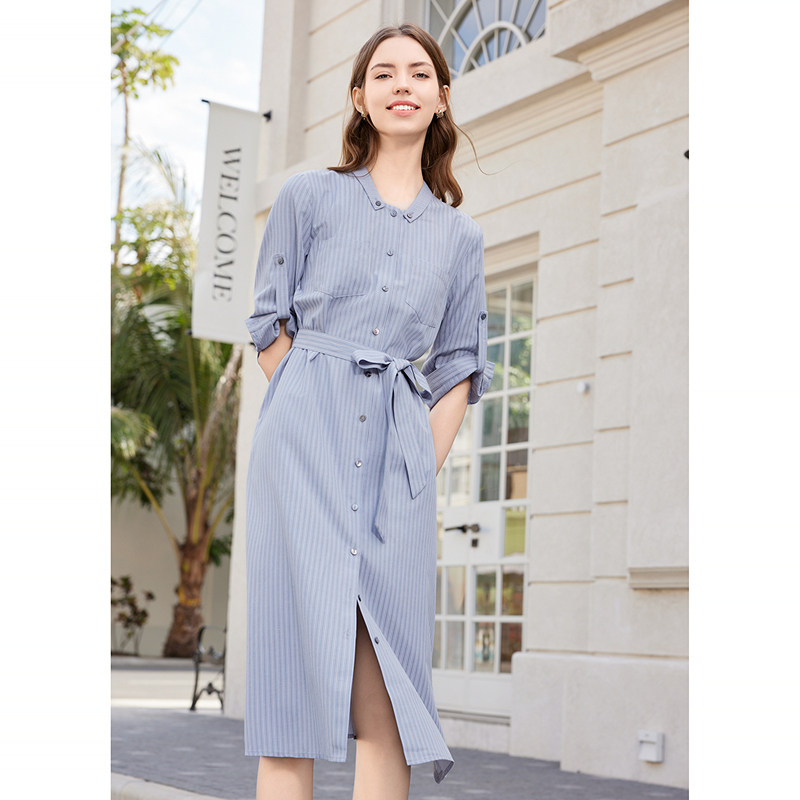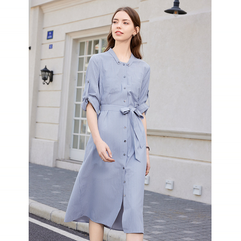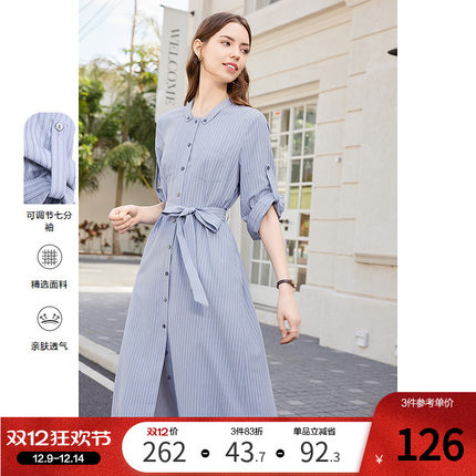 betu百图女装2024年秋装新款竖条纹收腰显瘦七分袖中长款连衣裙