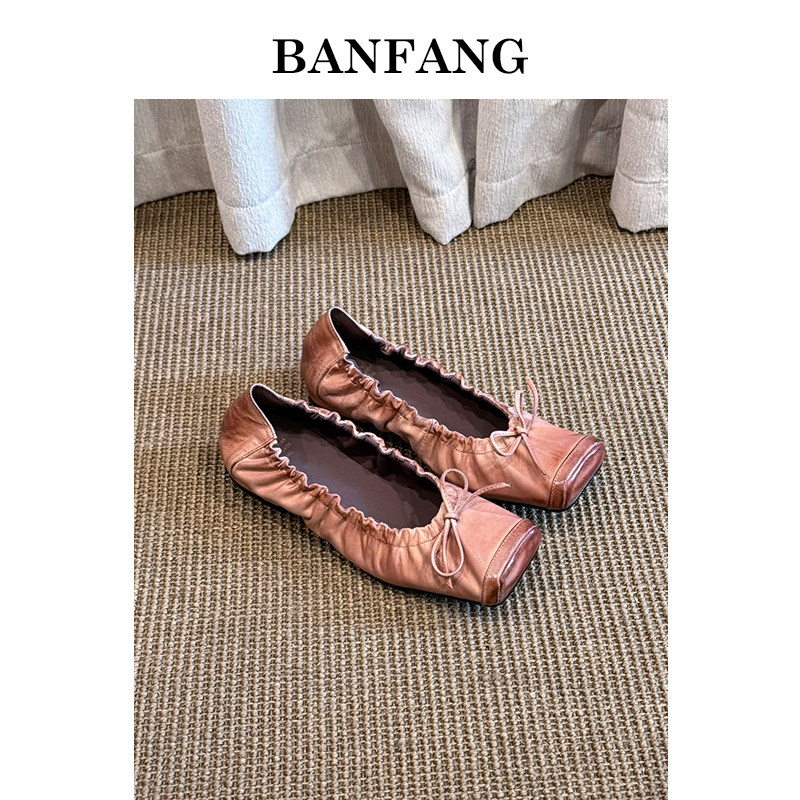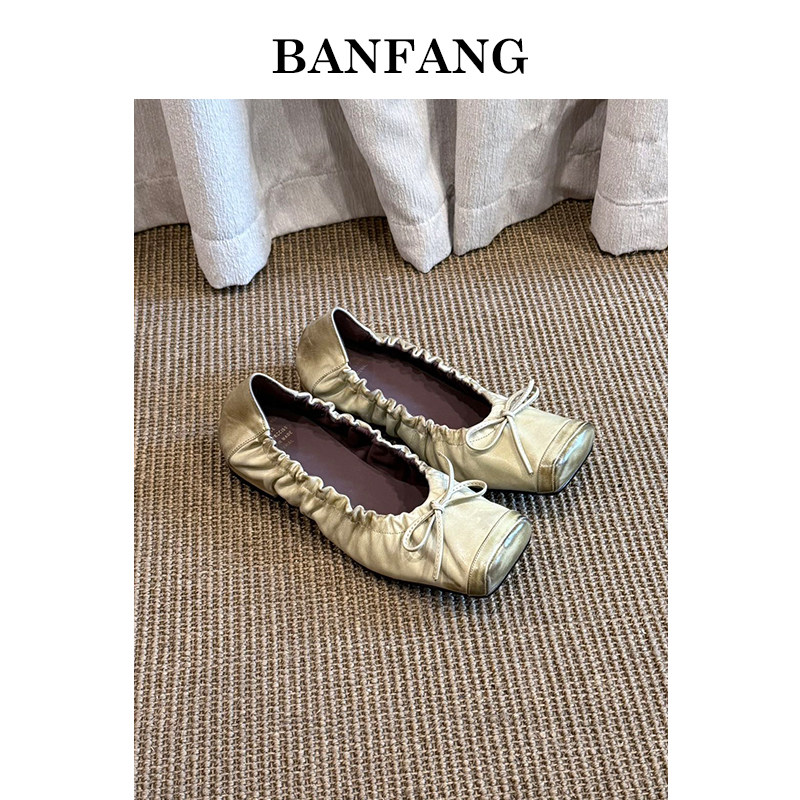 BANFANG女鞋低跟新款蝴蝶结芭蕾舞鞋软底浅口单鞋温柔风蛋卷鞋