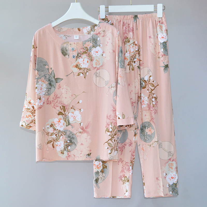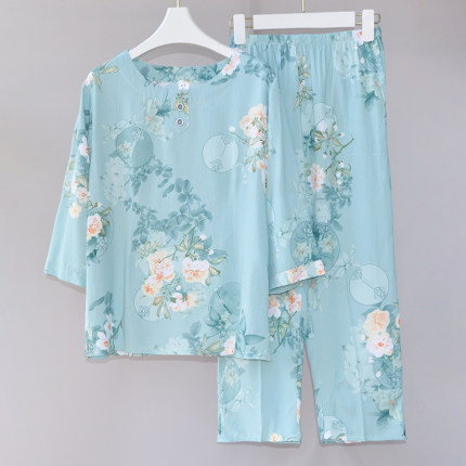 睡衣女夏季薄款棉绸中老年人妈妈宽松绵绸家居服七分袖外出套装