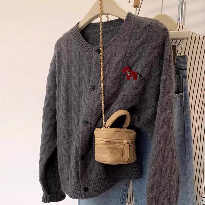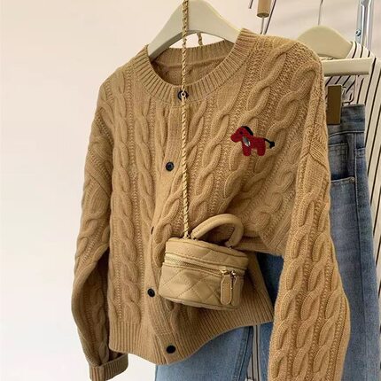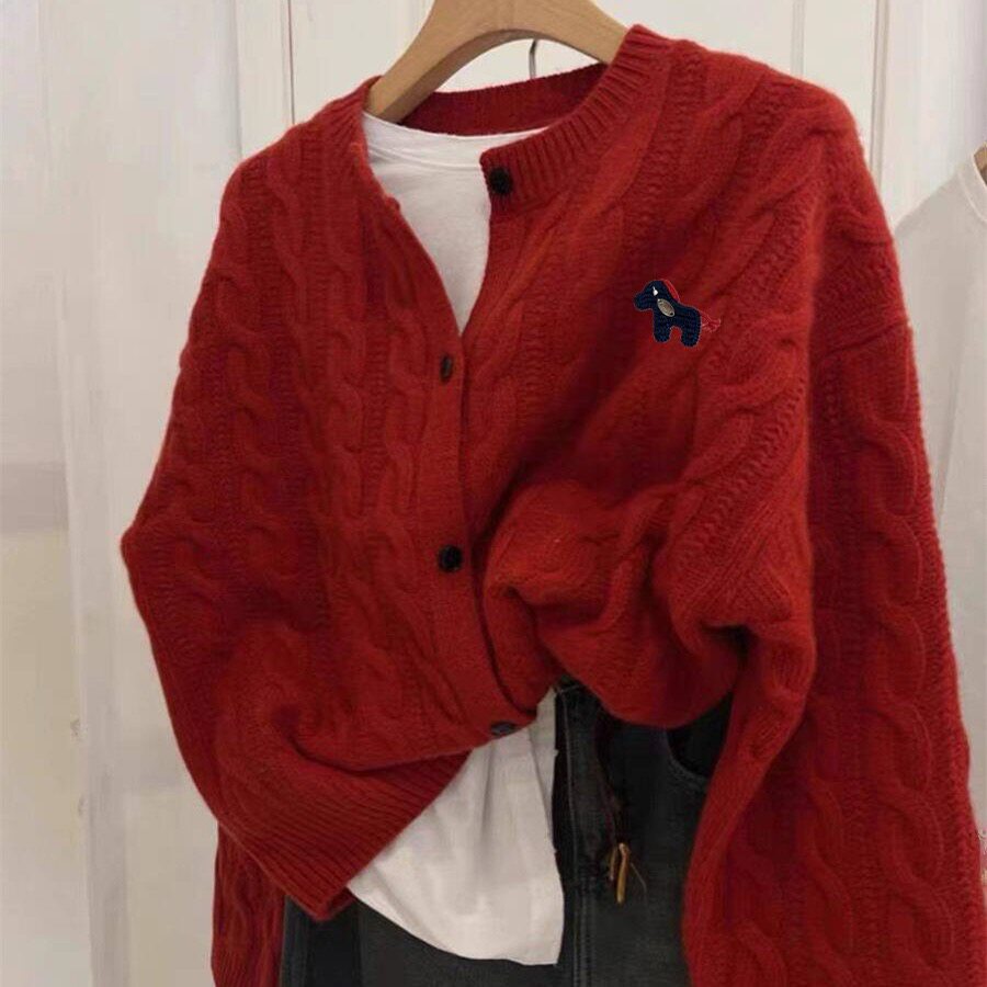 高端麻花100%羊毛针织开衫女宽松小马刺绣毛衣外套软糯圆领上衣