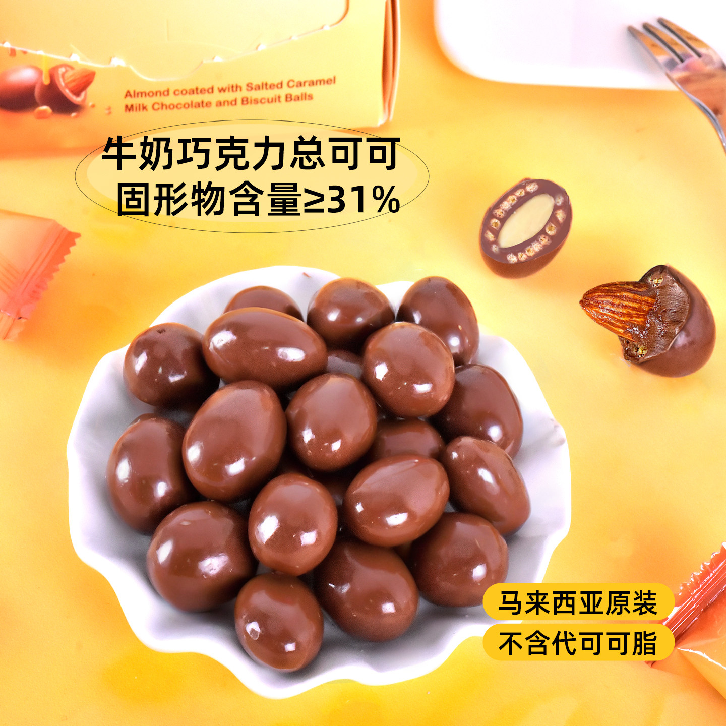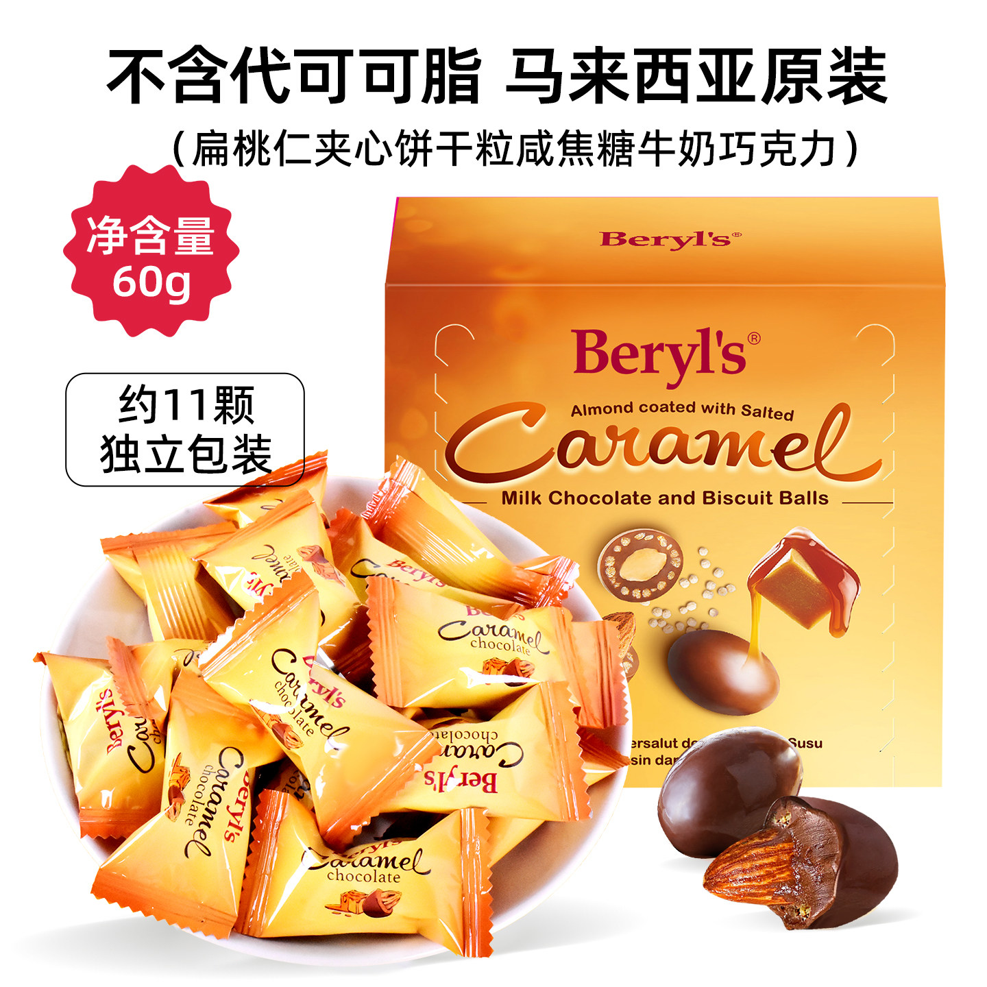 马来西亚同款进口beryls扁桃仁夹心饼干粒咸焦糖牛奶巧克力豆60g