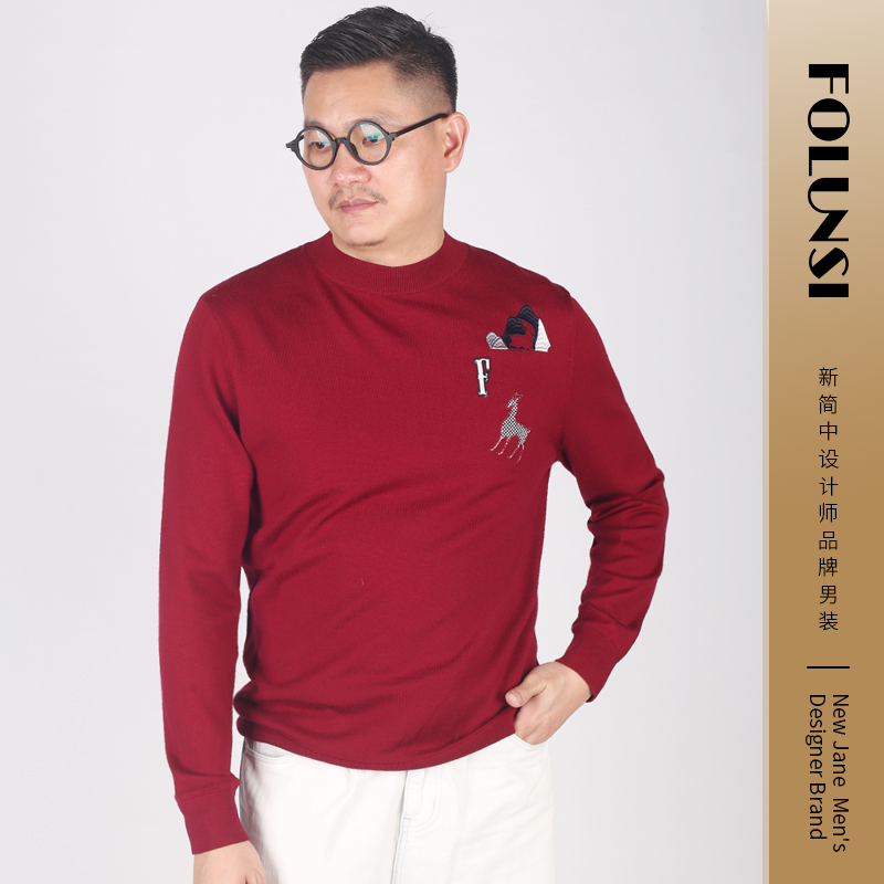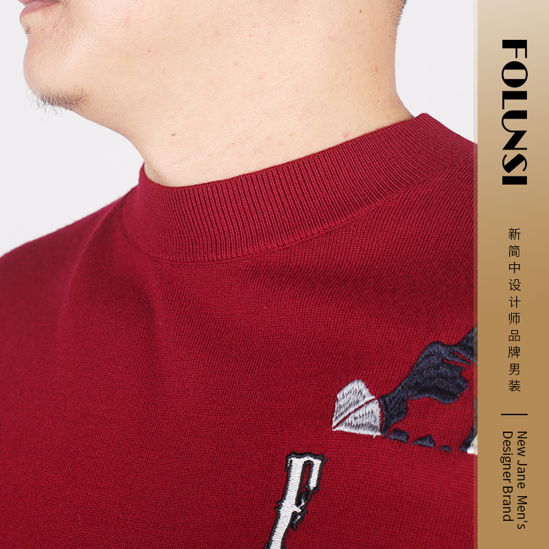佛伦斯folunsi秋冬男士毛衣羊毛衫修身休闲套头刺绣圆领打底