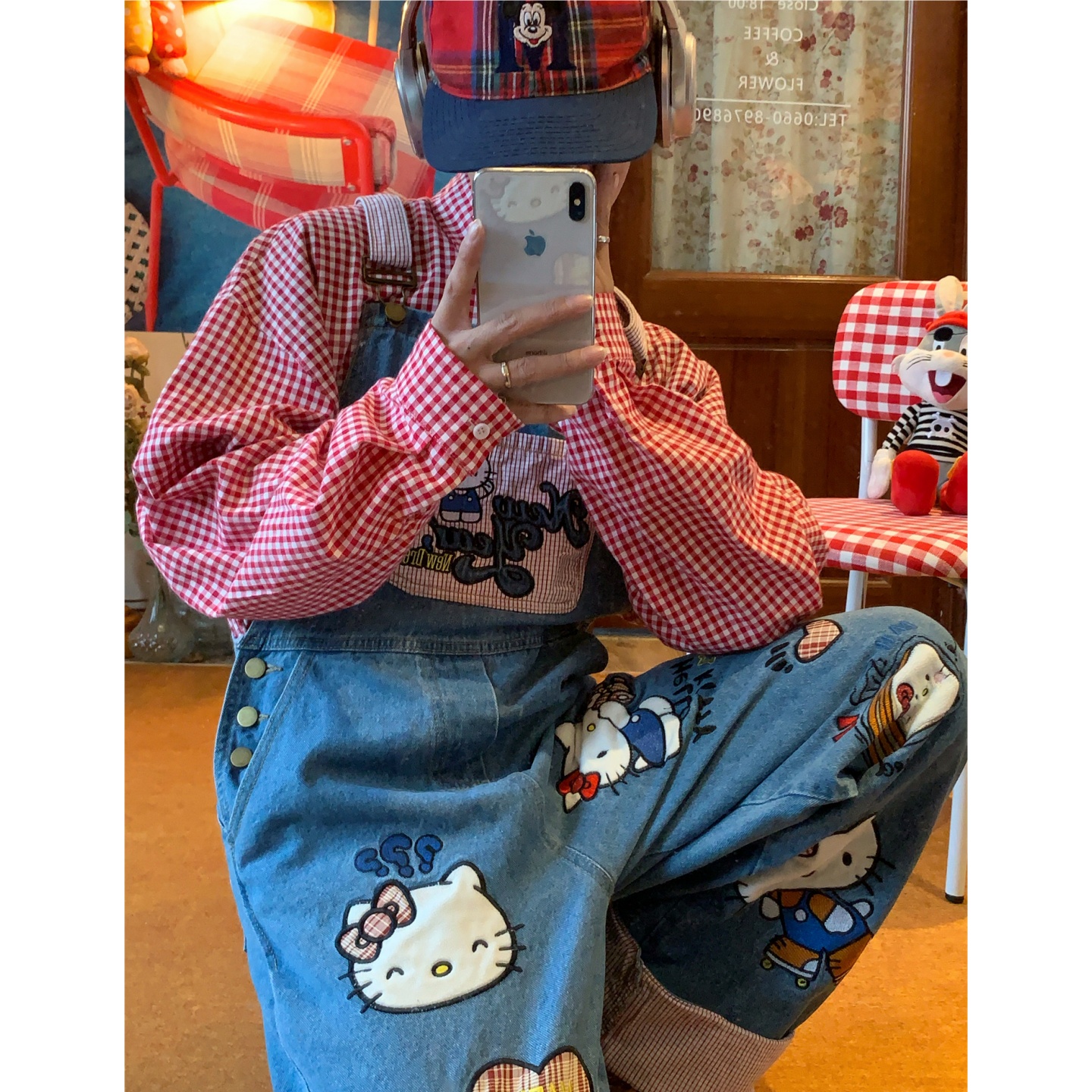 C2自制/卡通kitty猫减龄牛仔背带裤男女秋季新款宽松连体阔腿长裤
