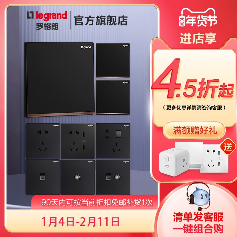 罗格朗插座开关面板三插五插双开多孔暗装家用86型五孔USB逸景黑