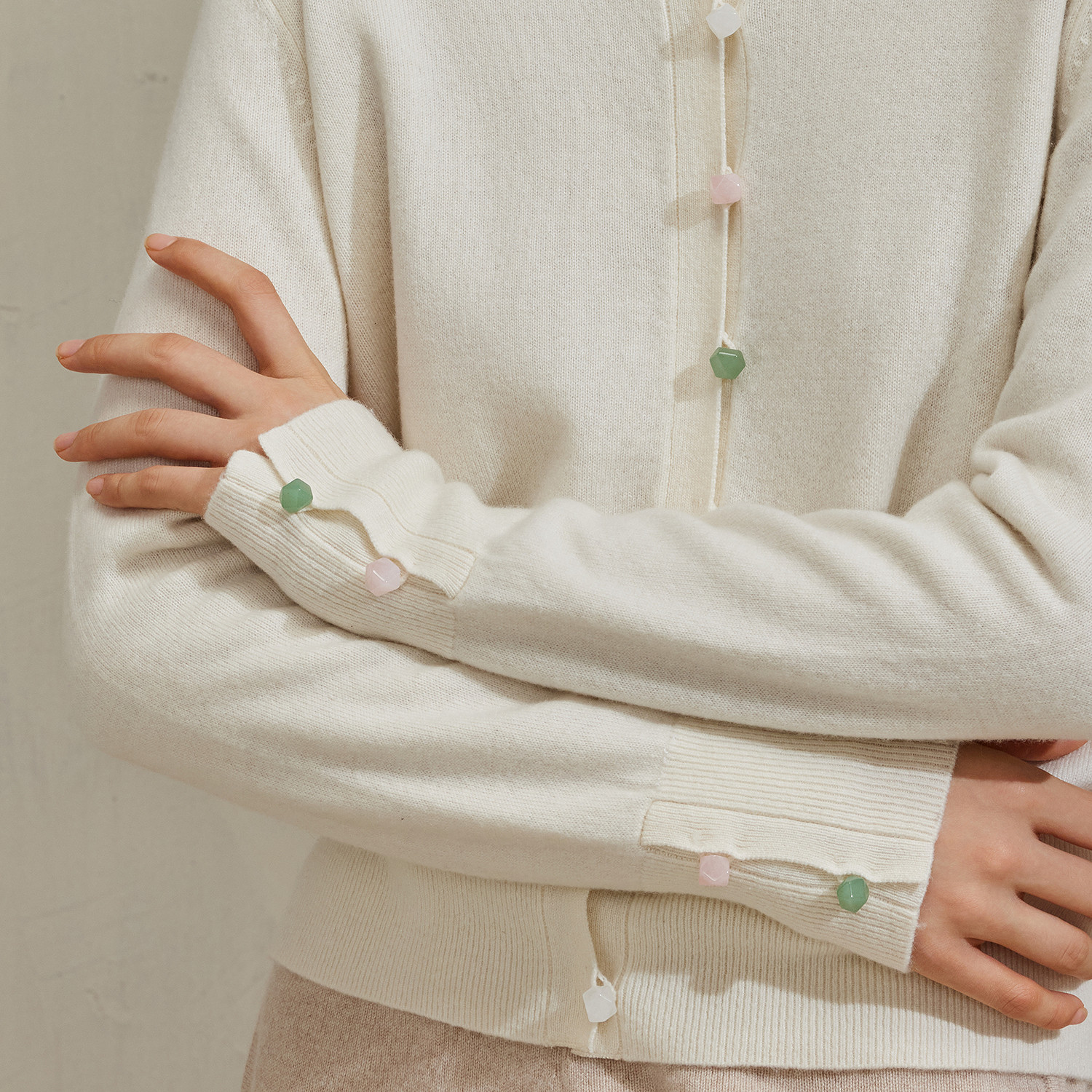 花朵扣羊绒开衫鄂尔多斯圆领纯色
