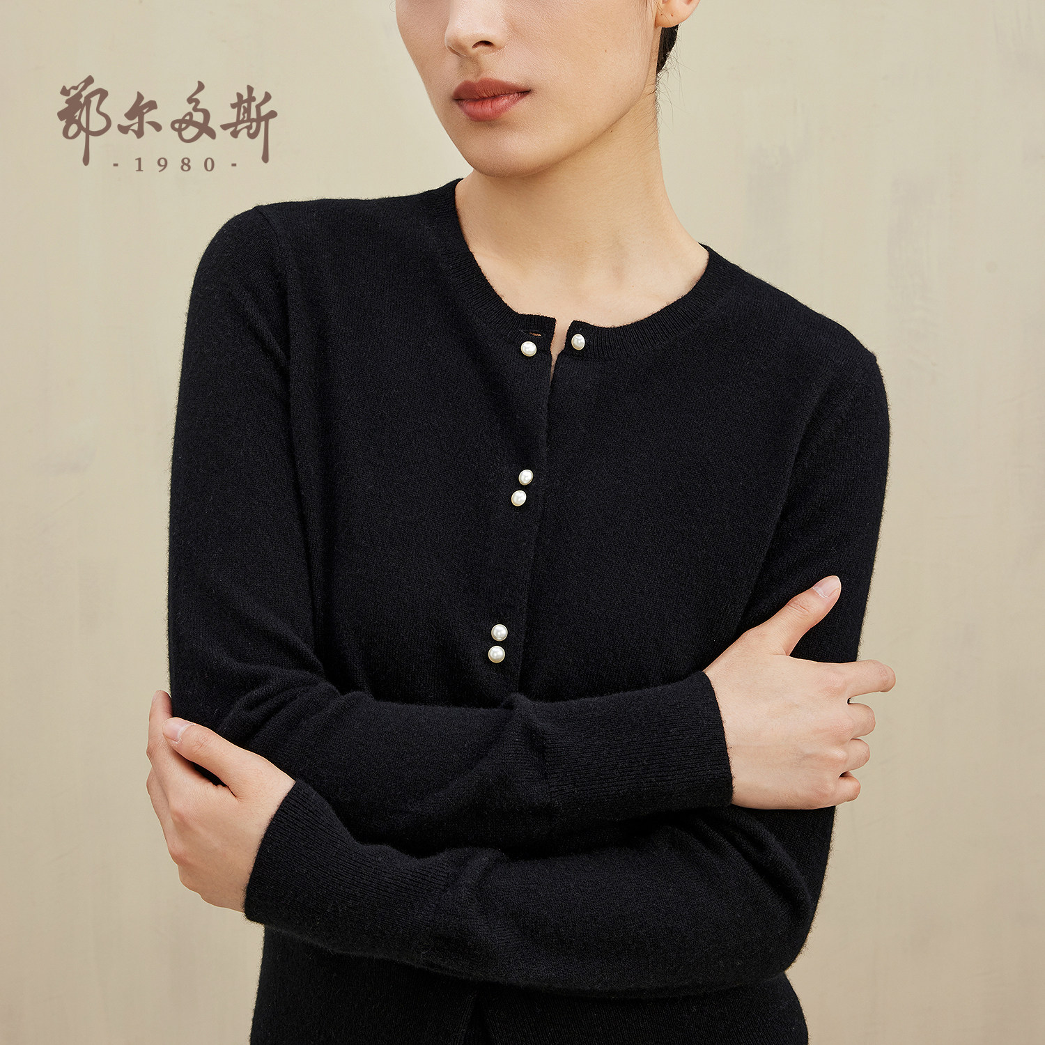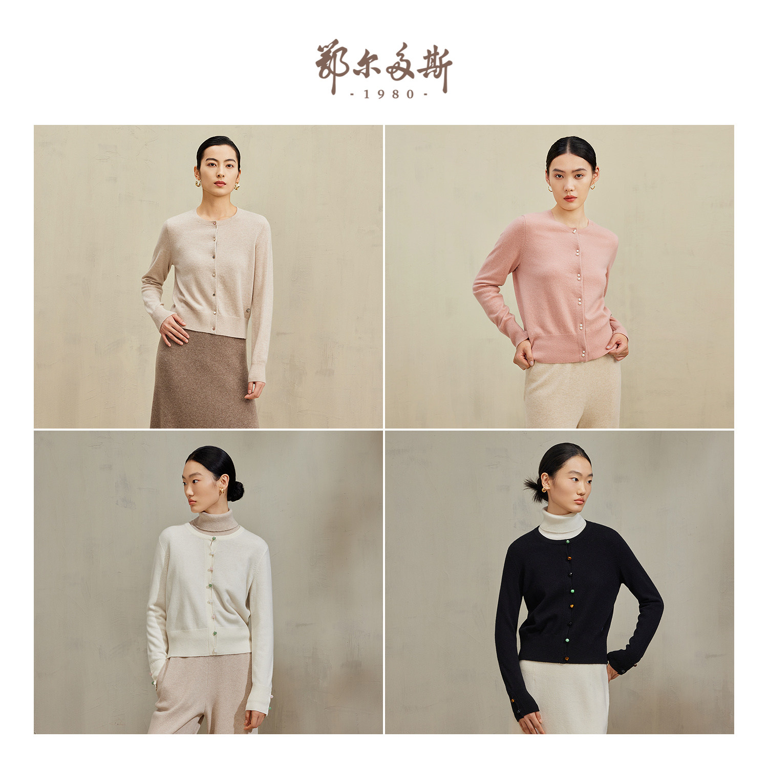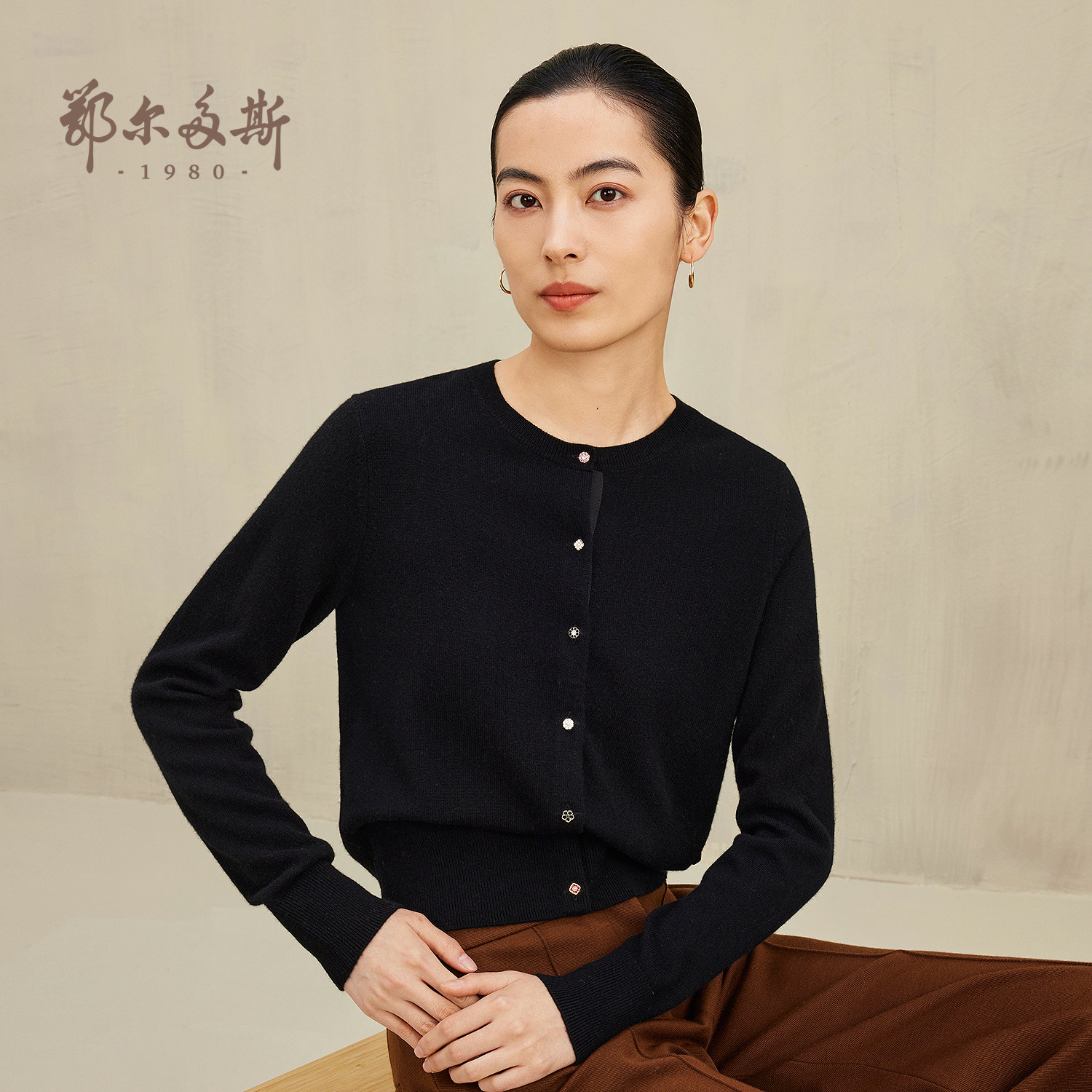 【爆款花朵扣纯羊绒开衫】鄂尔多斯1980 开衫女秋冬圆领针织外套