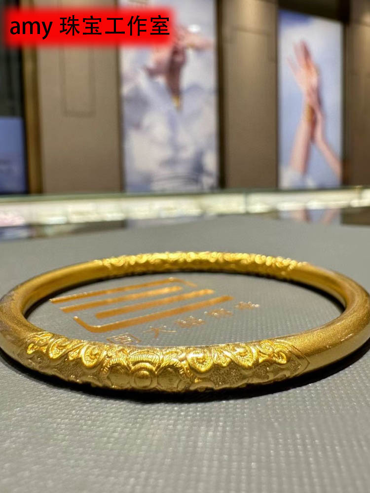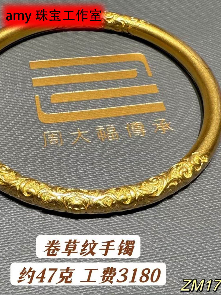 周大福传承内地999足金计价克减100厚壁中空黄金卷草纹手镯女哪吒