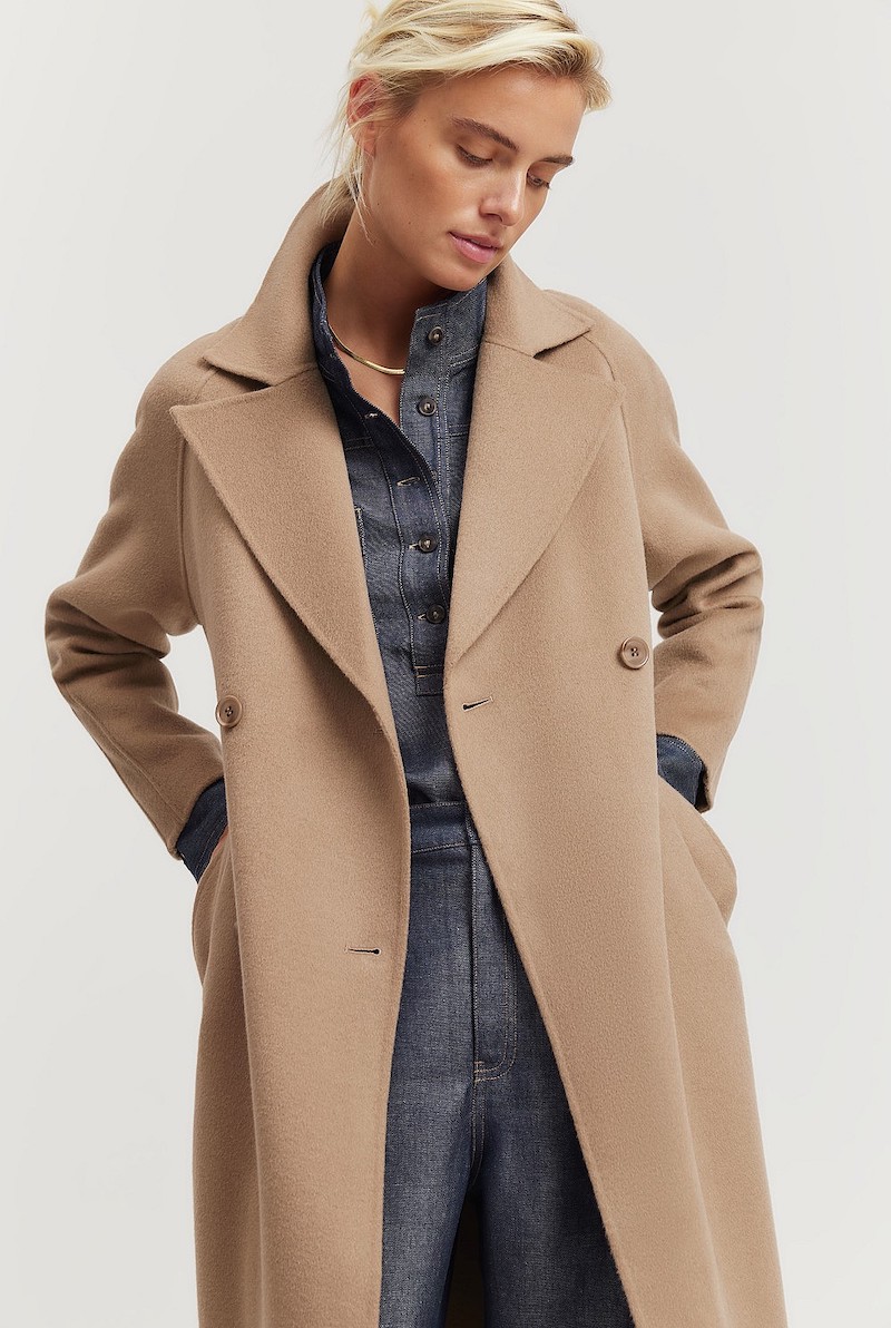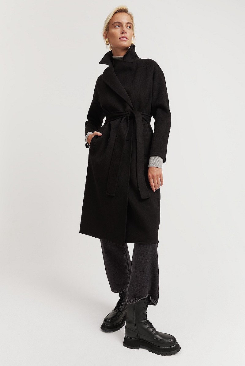 欧美简约冬季新品大翻领双排扣可绑腰带倾斜的侧袋羊毛呢子大衣女