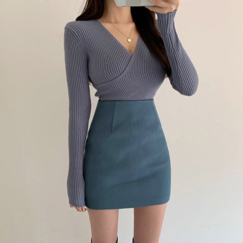 毛呢半身裙女秋冬蓝色紧身包臀裙高腰显瘦黑色弹力一步裙短裙杏色