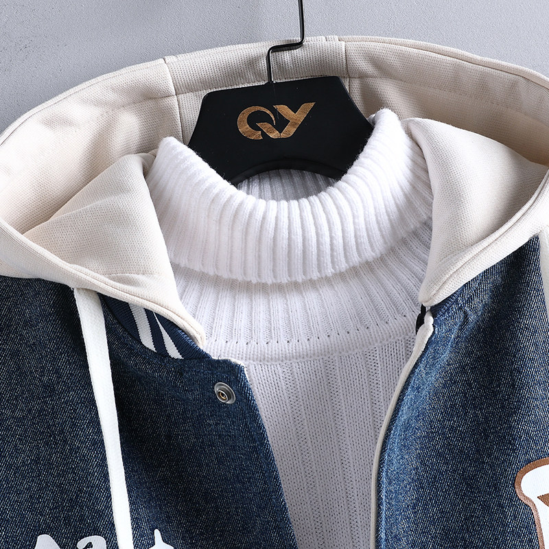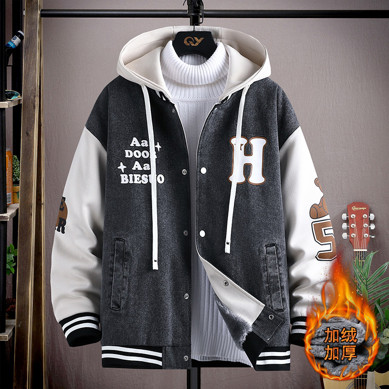 青少年2025冬季加绒加厚牛仔外套男款学生帅气棒球服夹克棉衣以純