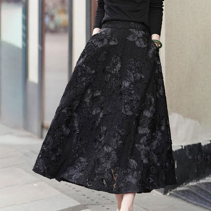 黑色提花蕾丝拼接绝美半身裙2025早秋新款大码定制高端精致裙子