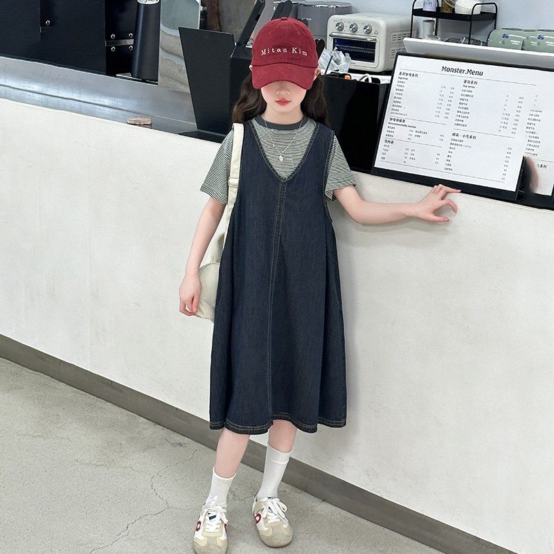 女童夏装套装2025新款女大童夏季韩系牛仔背带裙儿童短袖两件套