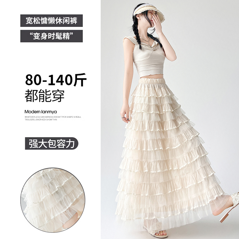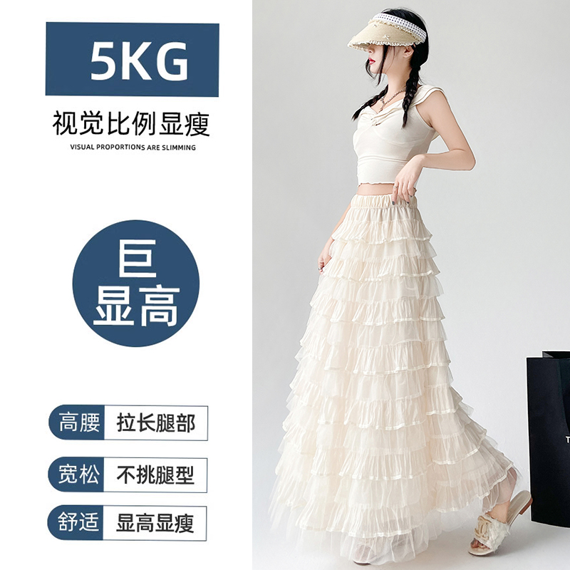 芭蕾风网纱蓬蓬蛋糕半身裙女春夏季高腰a字荷叶边小个子百褶裙子