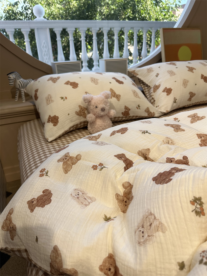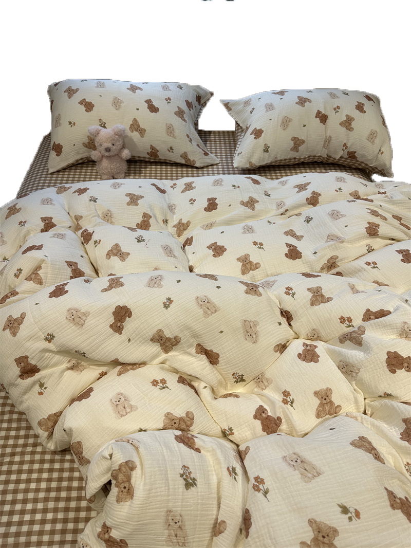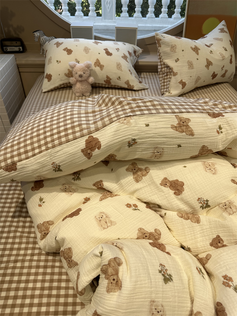 卡通可爱小呆熊双层皱皱纱格子水洗棉四件套全棉1.5m1.8公寓被套
