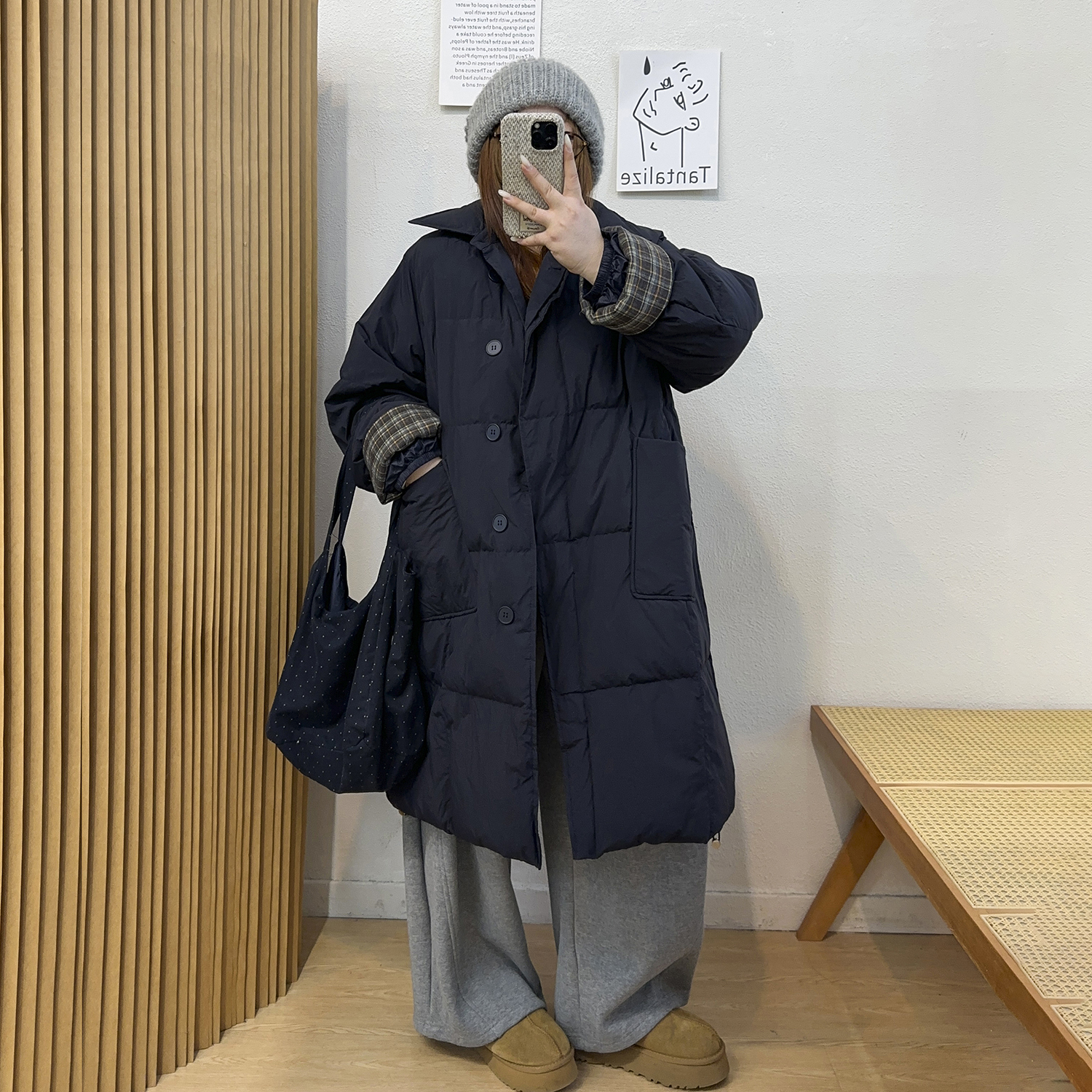 宛宛大码女装撞色羽绒服胖mm冬季新款宽松长款连帽保暖白鸭绒外套