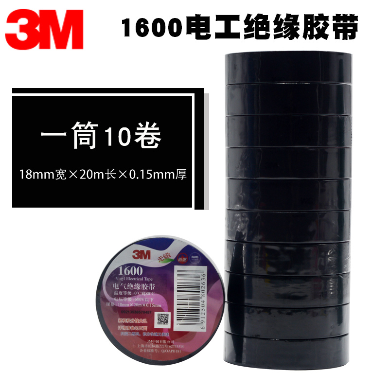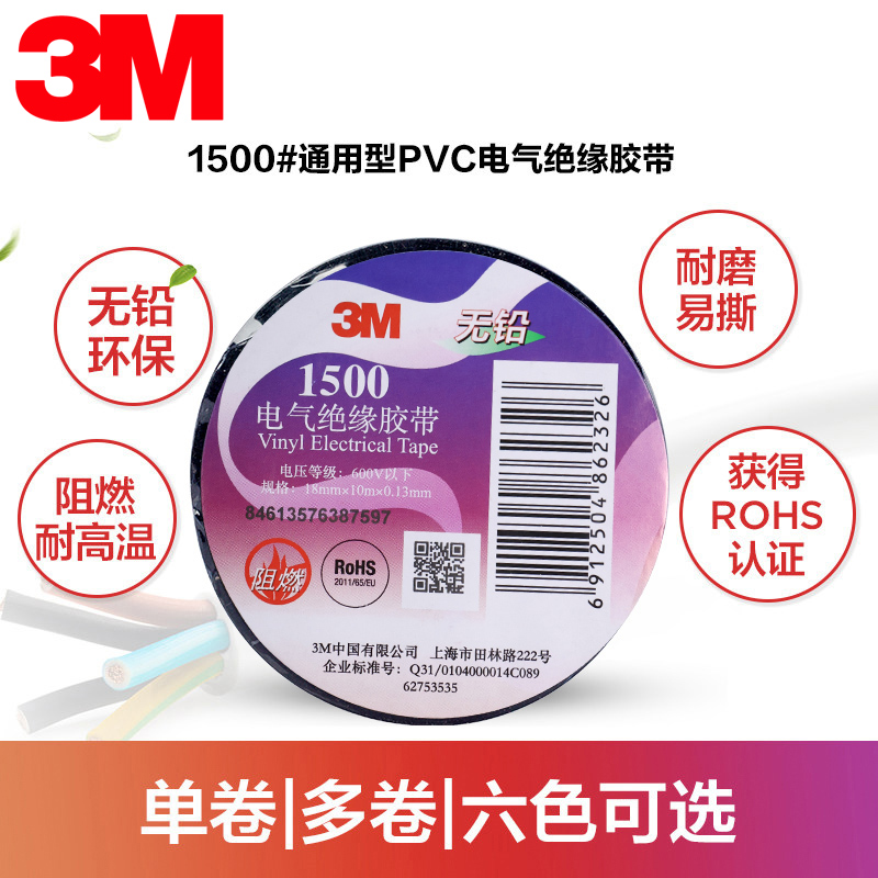 3M电工胶带1500电气通用型无铅防水防火阻燃胶布PVC绝缘胶布10卷